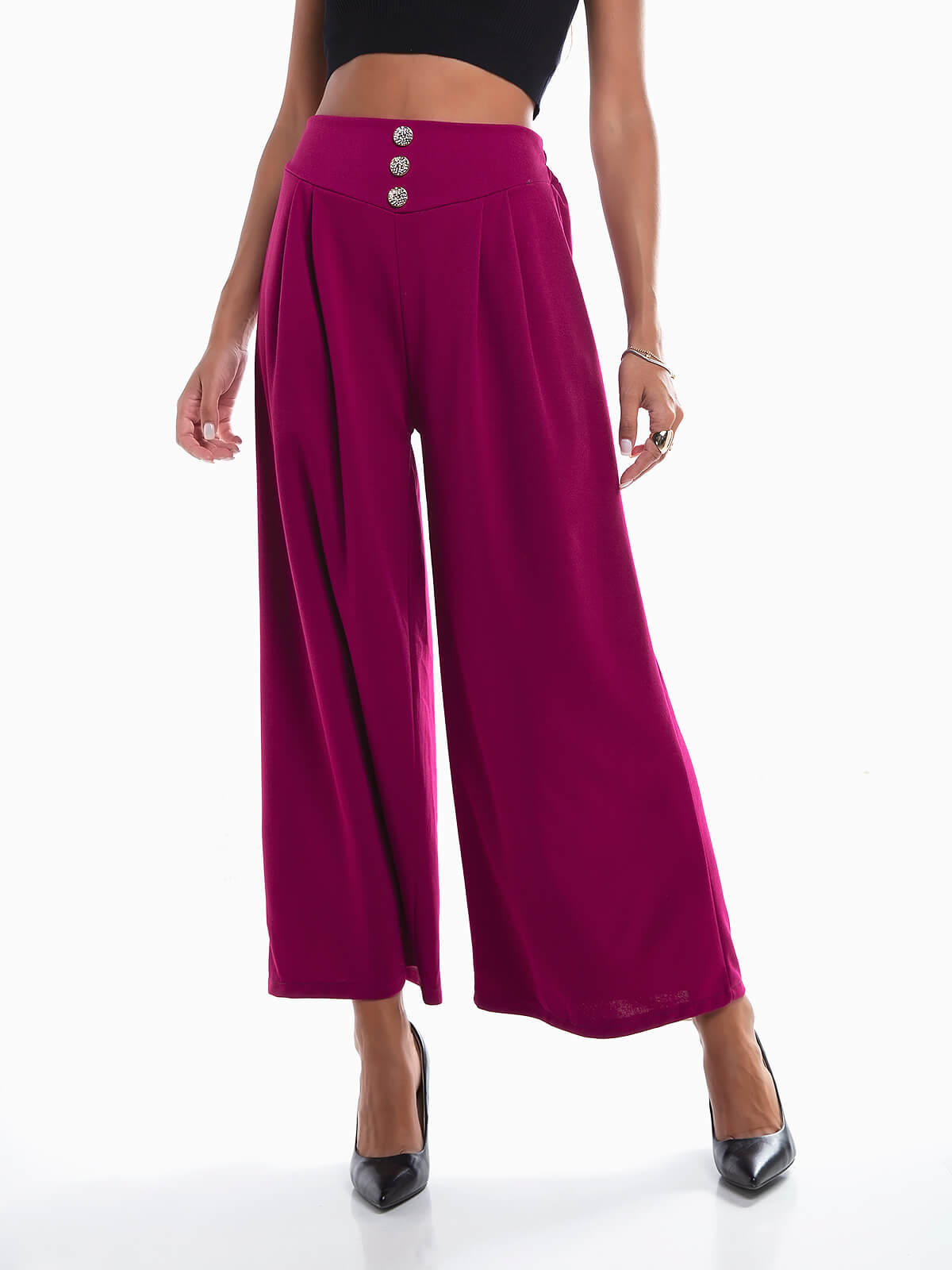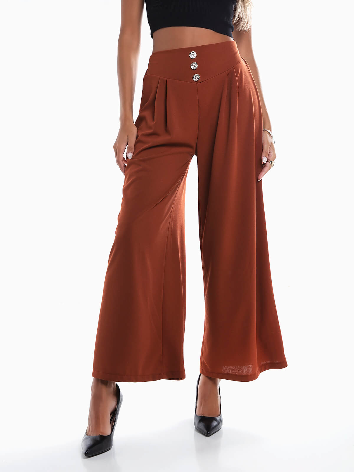 Calças largas com botões dourados decorativos. Calças fluídas de cintura alta elástica. Pormenor pregas à frente.
