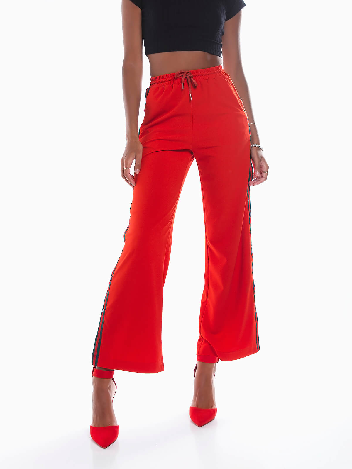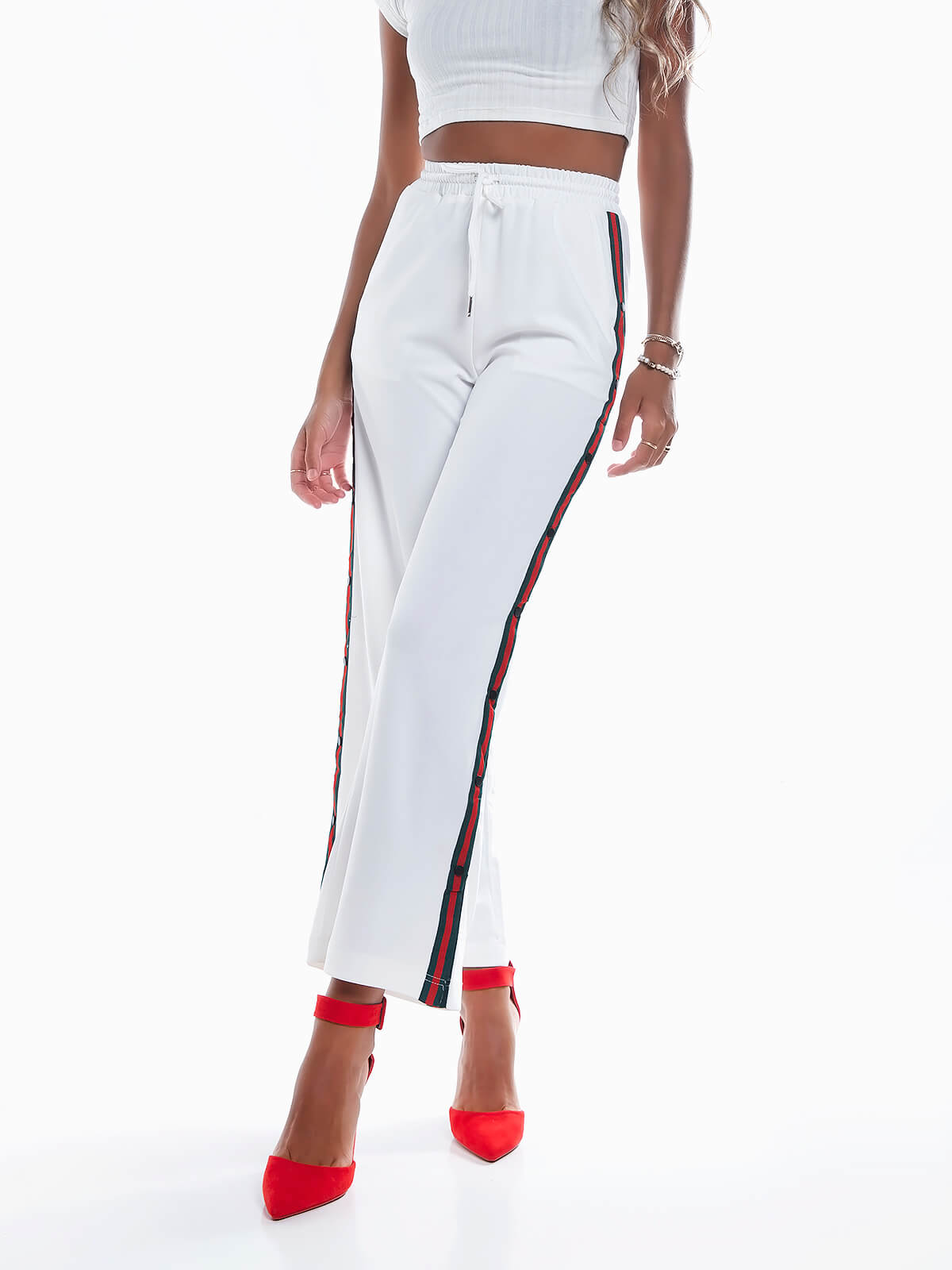 Calças largas com botões de pressão laterais para abertura. Calças de cintura elástica com cordão para ajustar. Bandas de cor laterais em contraste. 2 bolsos.