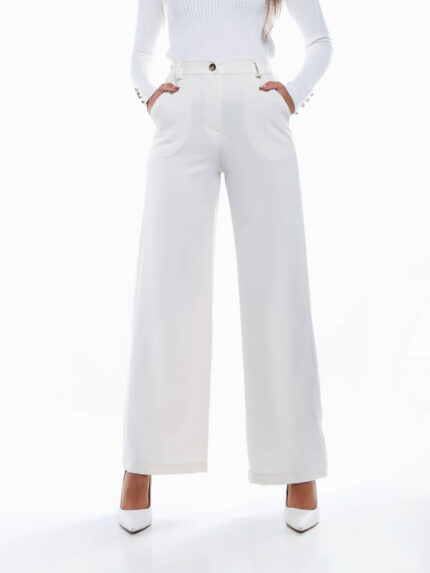 Calças largas de cintura alta para senhora. Calças alfaiataria com 2 bolsos laterais e 1 na parte posterior. Aperto fecho éclair e colchetes.