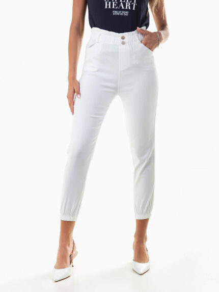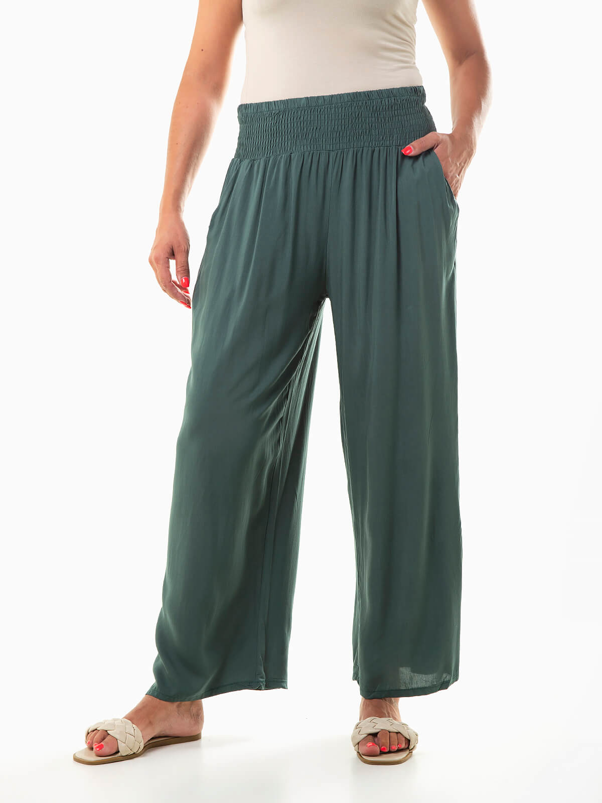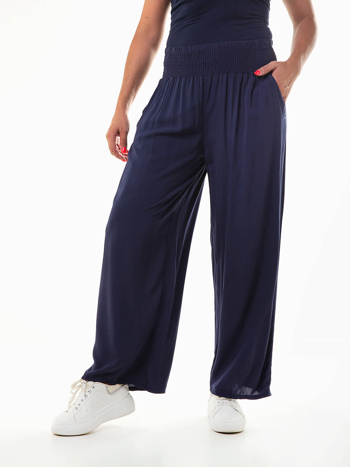 Calças largas de cintura alta com franzido smock. Calças para senhora confecionadas em tecido mistura algodão para maior conforto. 2 bolsos.