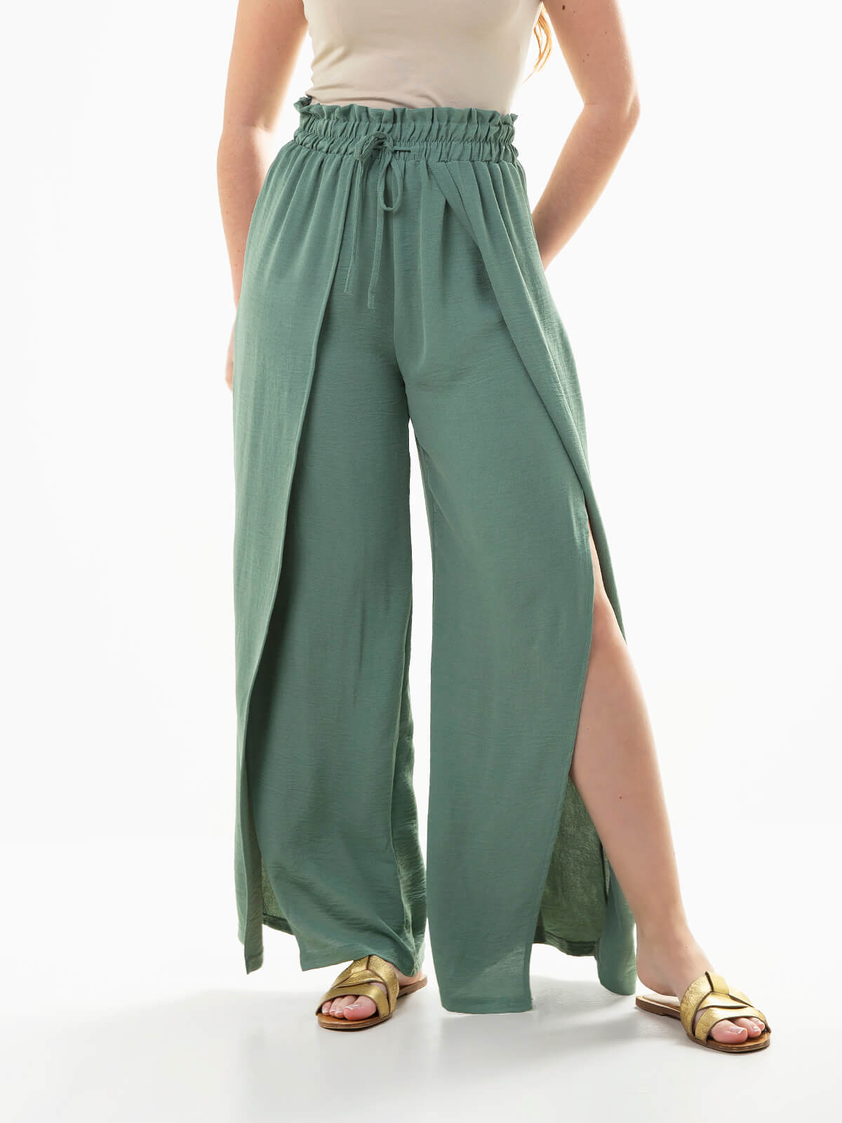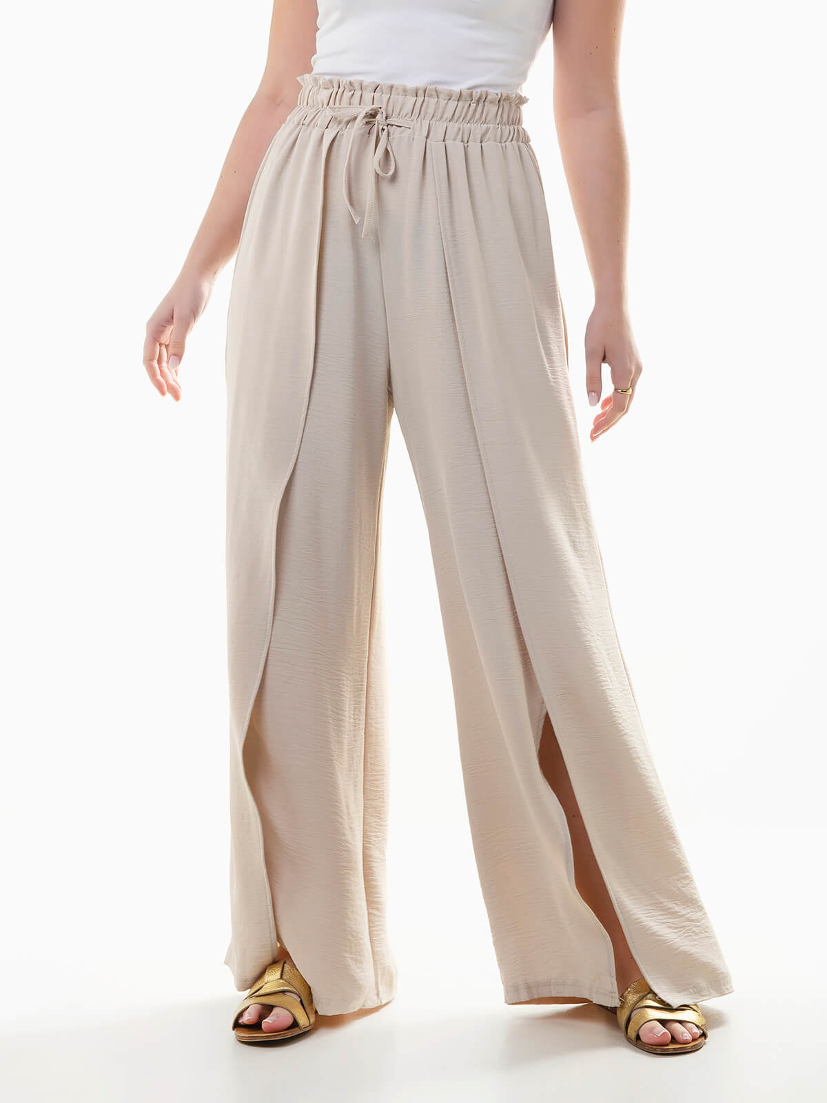 Calças largas com aberturas à frente. Calças para mulher com cintura alta paperbag e cordão para ajustar.