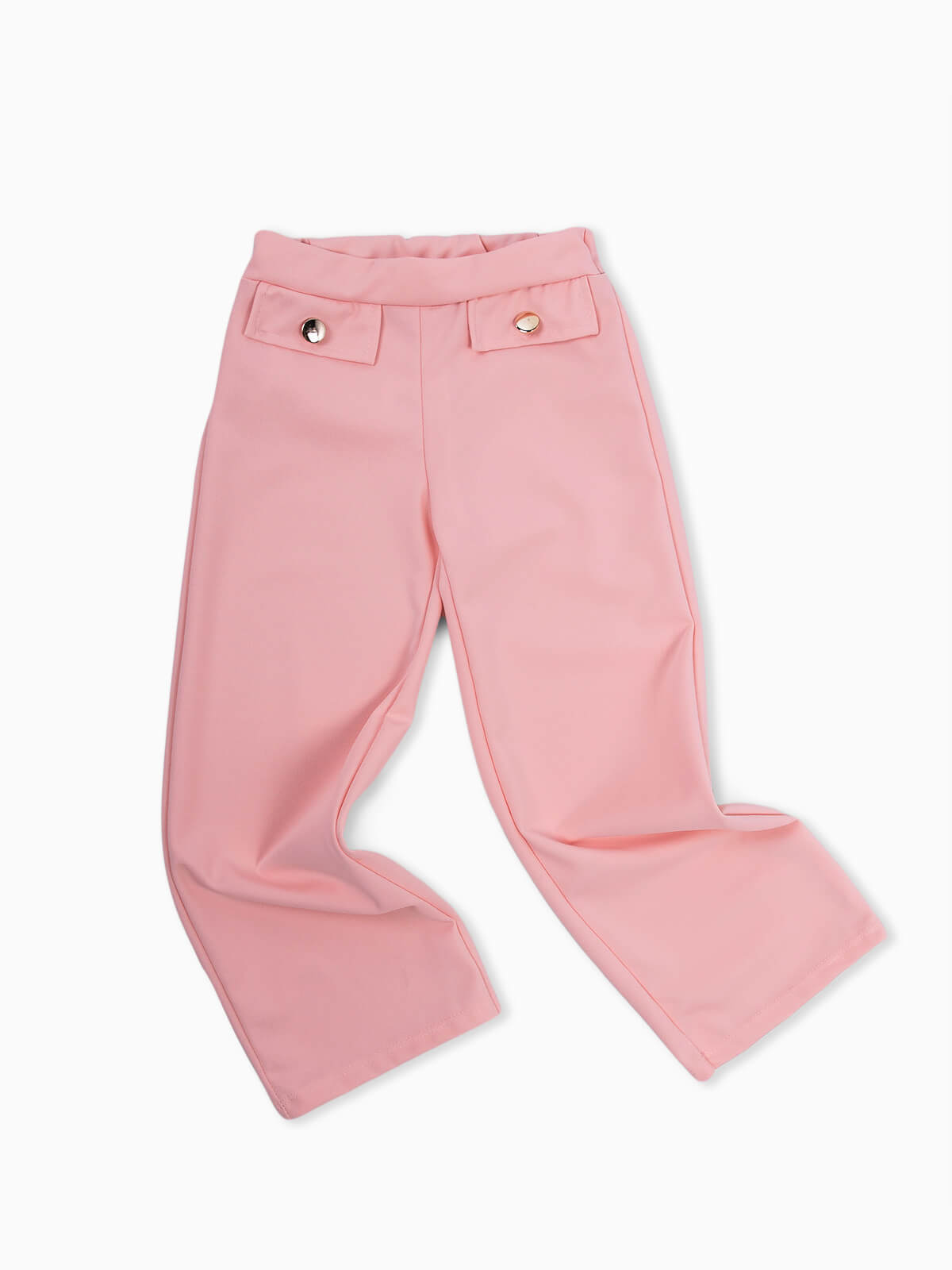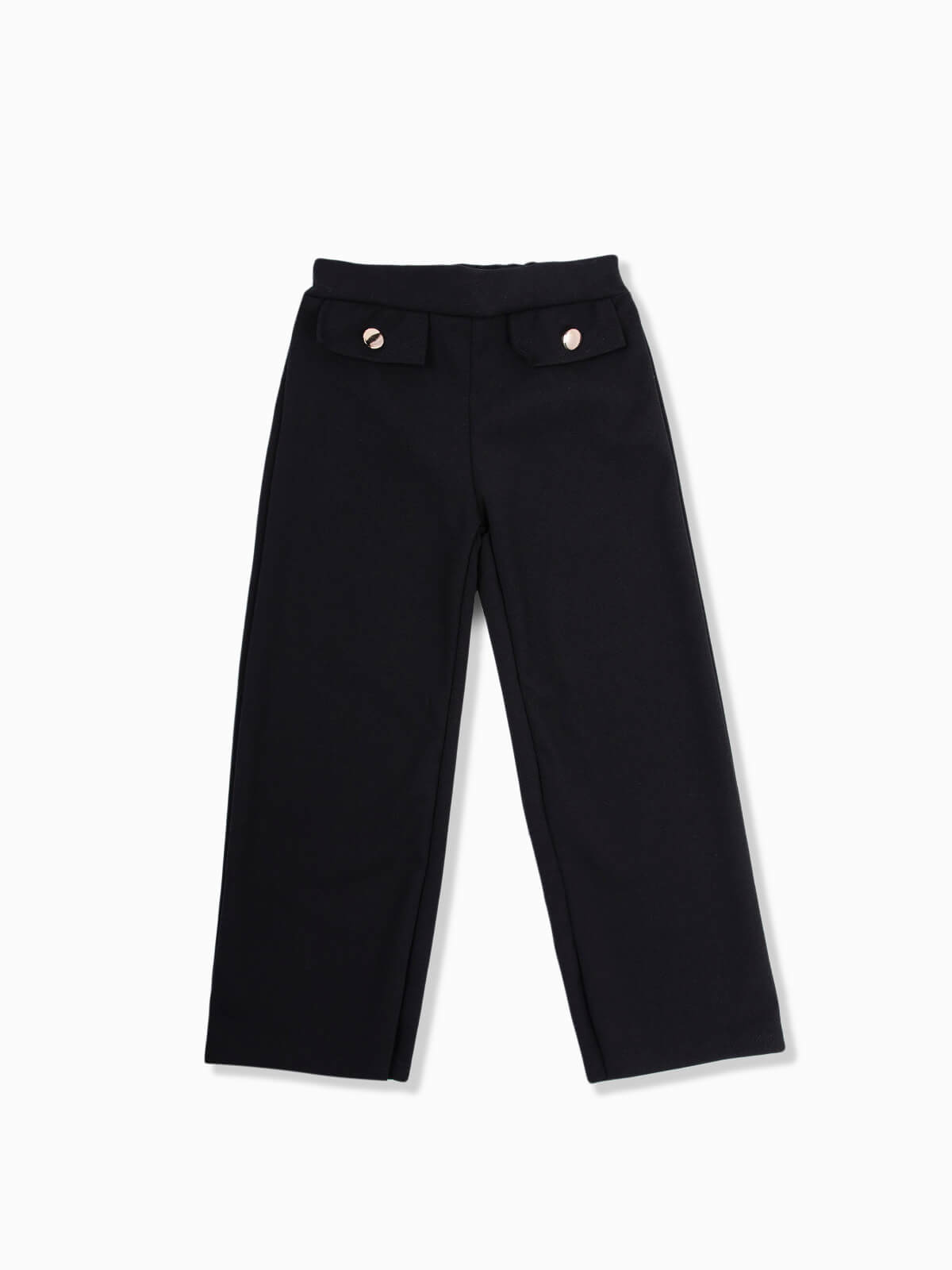 Calças largas com botões e palas decorativas. Calças para menina de cintura alta elástica.
