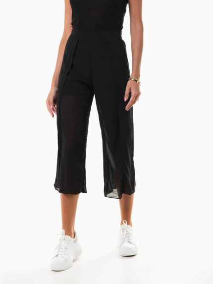 Calças largas com estampado abstrato para senhora. Calças em tecido leve e fluído com cintura alta elástica. 2 bolsos laterais.