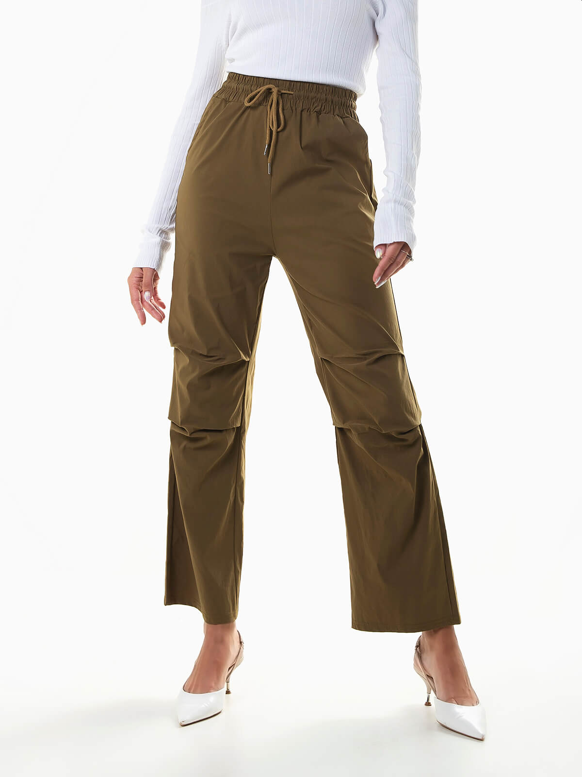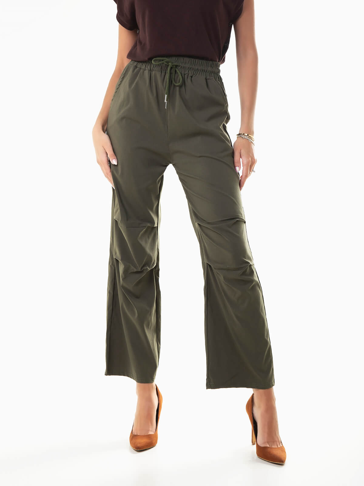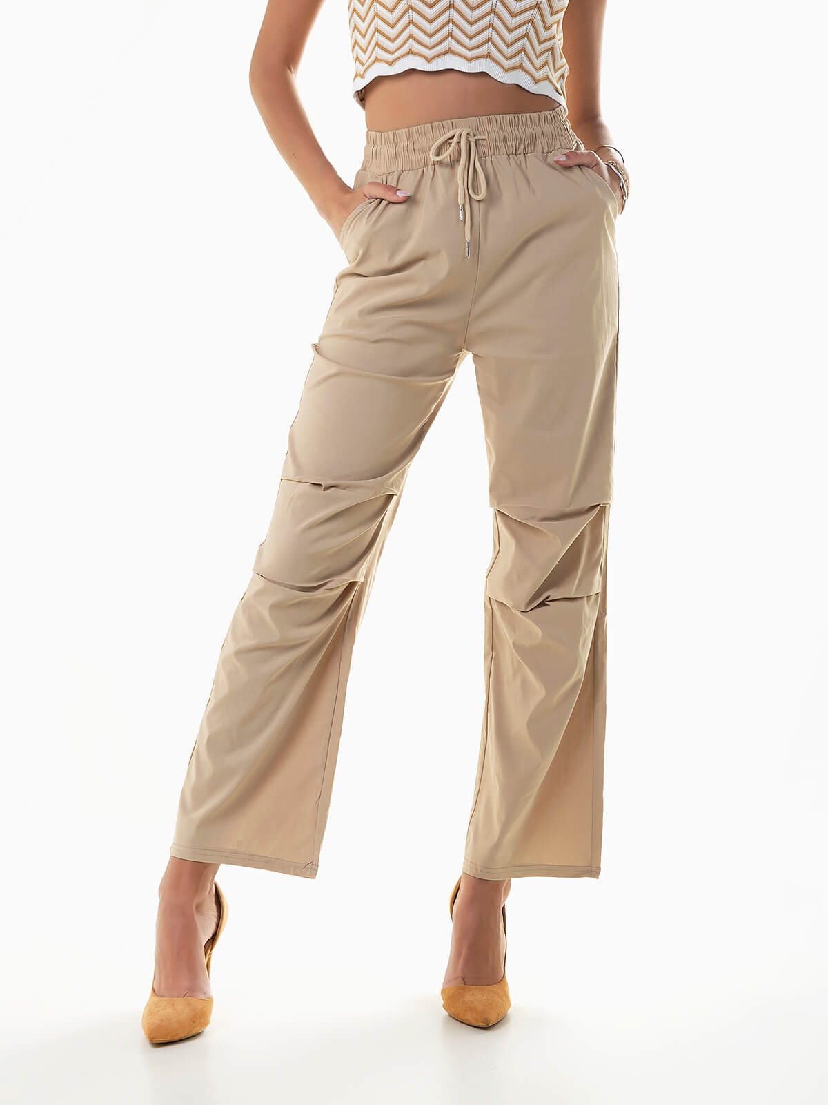 Calças largas em tecido elástico e impermeável. Calças de cintura alta elástica com pormenor de pregas nos joelhos. Cordão para ajustar. 2 bolsos.