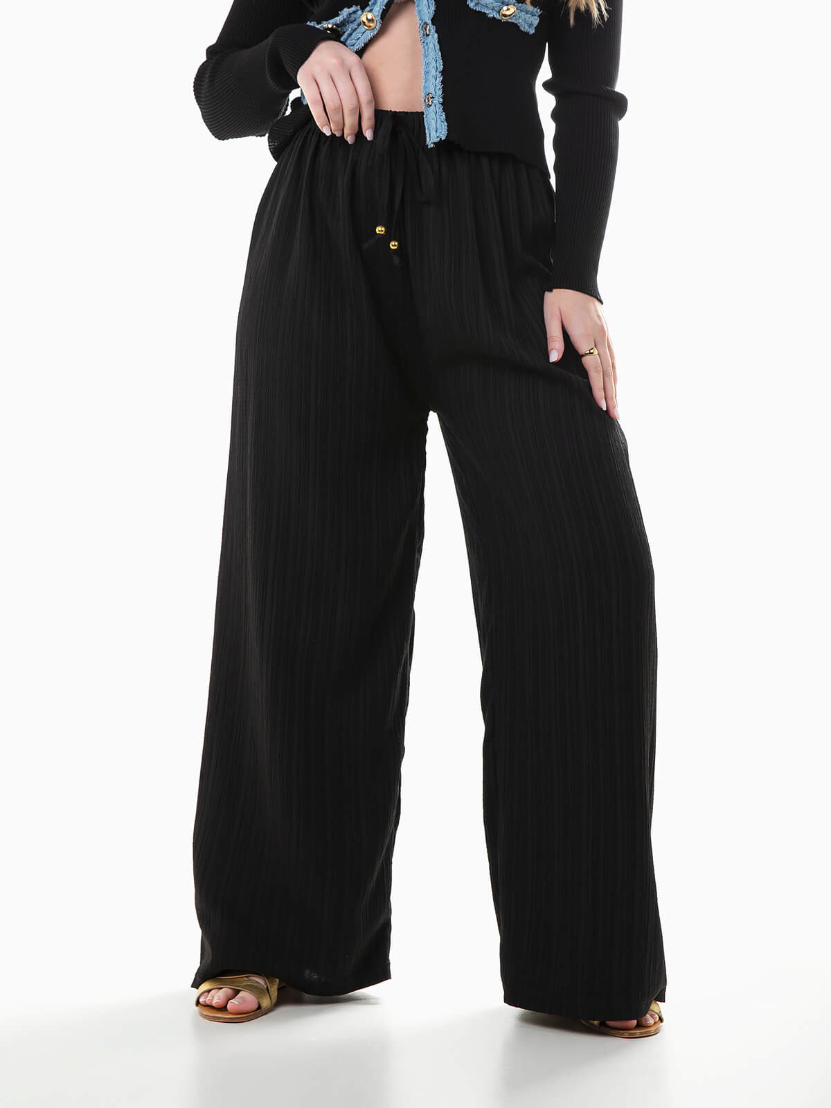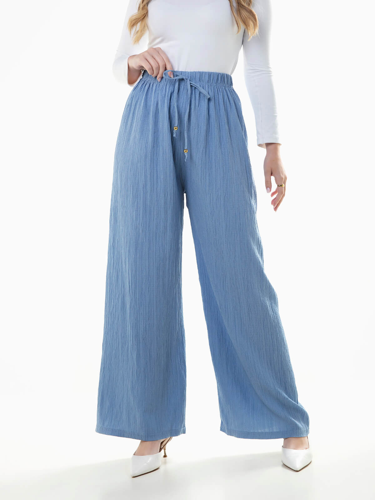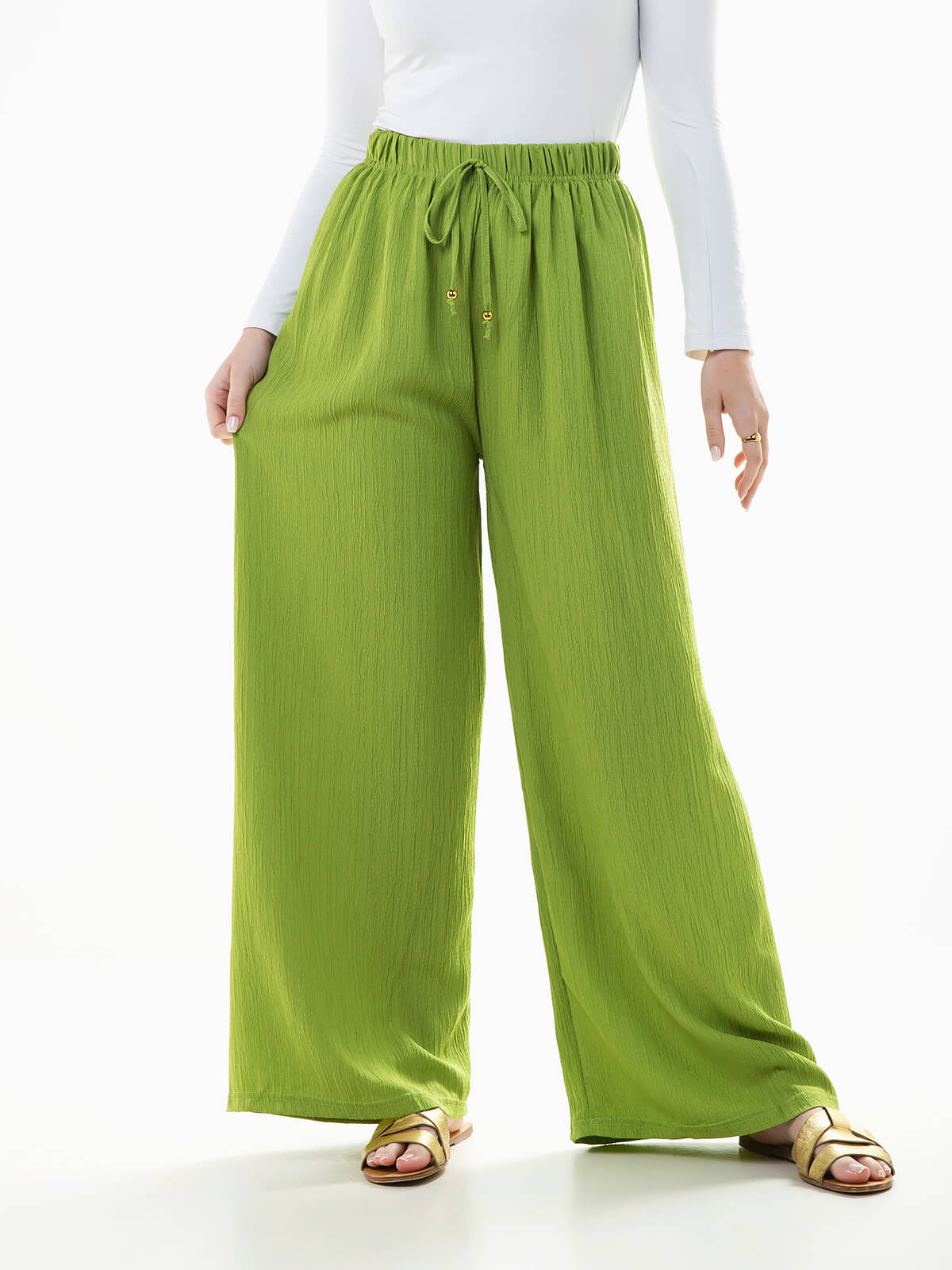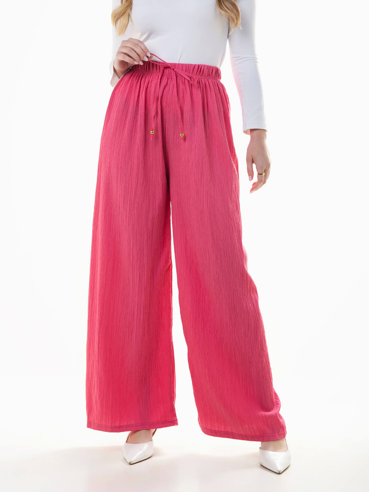 Calças largas em tecido com textura efeito crepe. Calças para mulher com cintura alta elástica e cordão para ajustar.