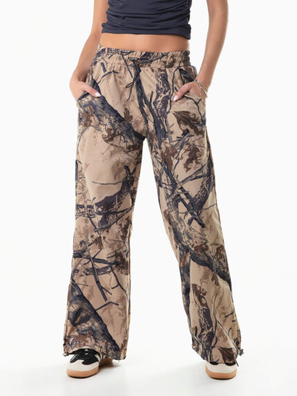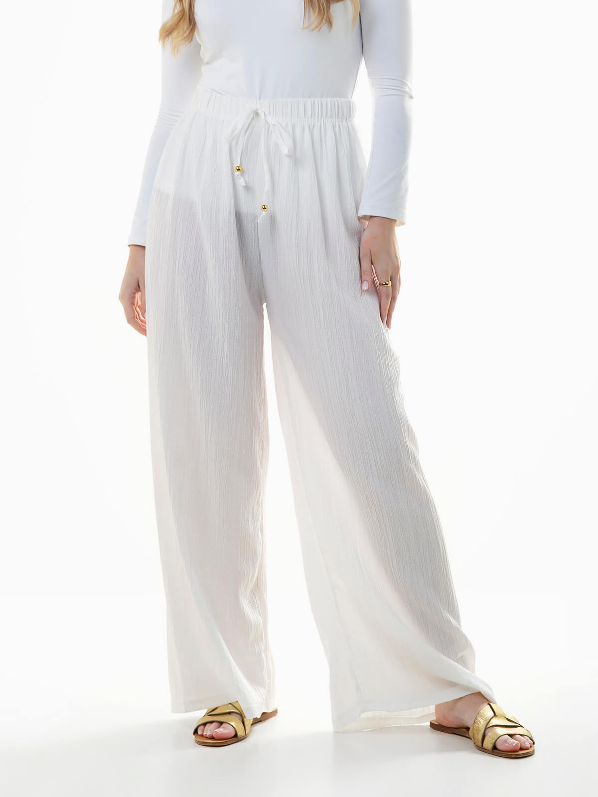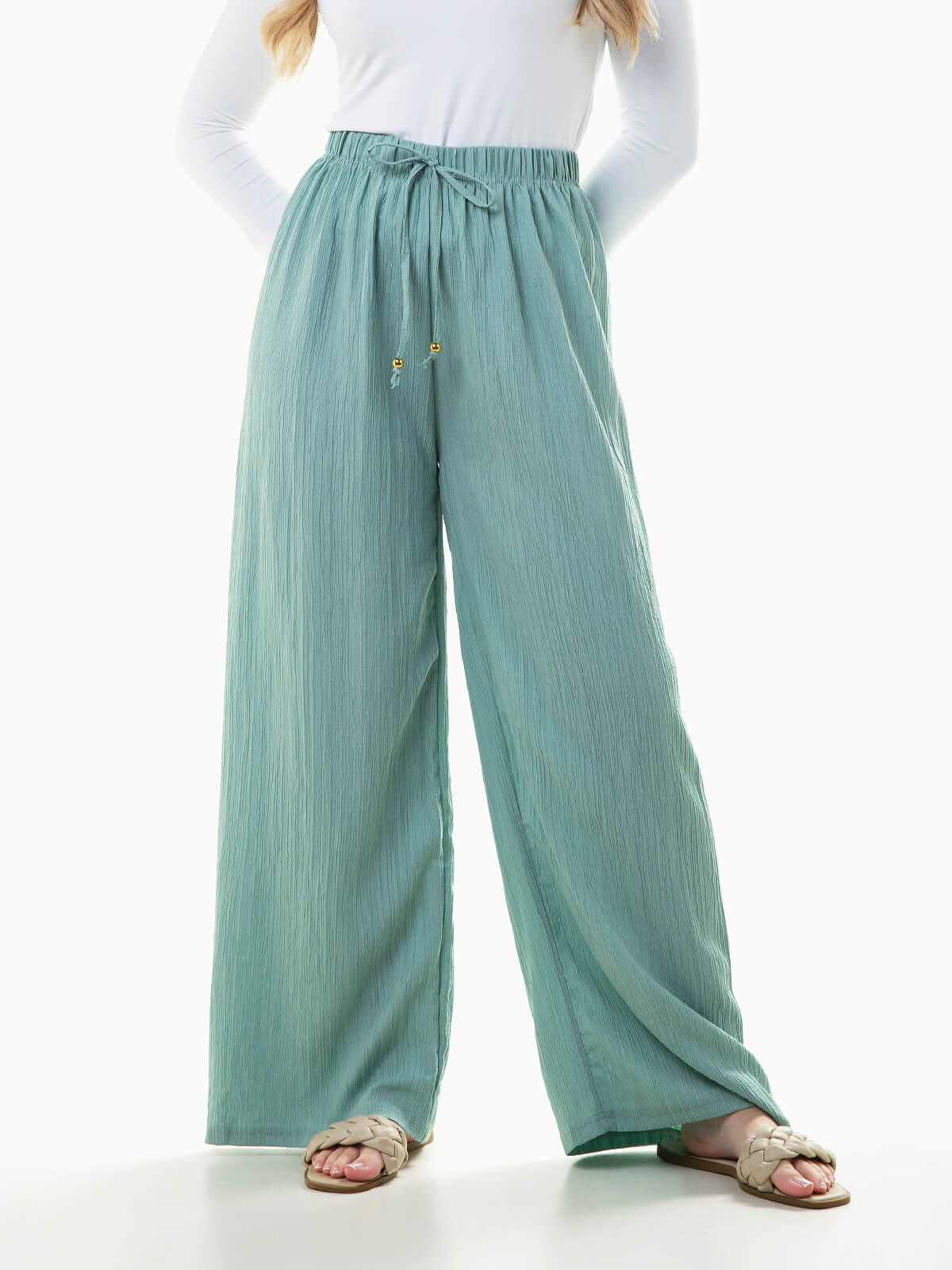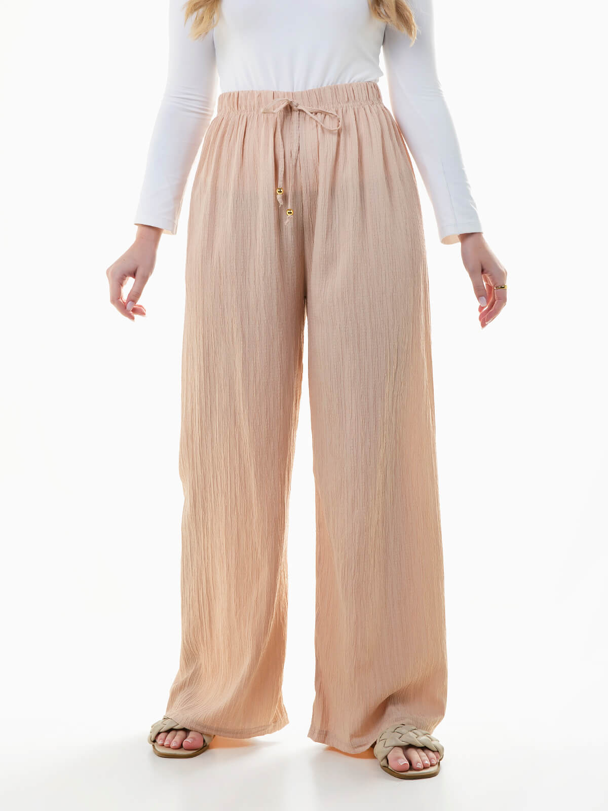 Calças largas em tecido com textura efeito crepe. Calças para mulher com cintura alta elástica e cordão para ajustar.
