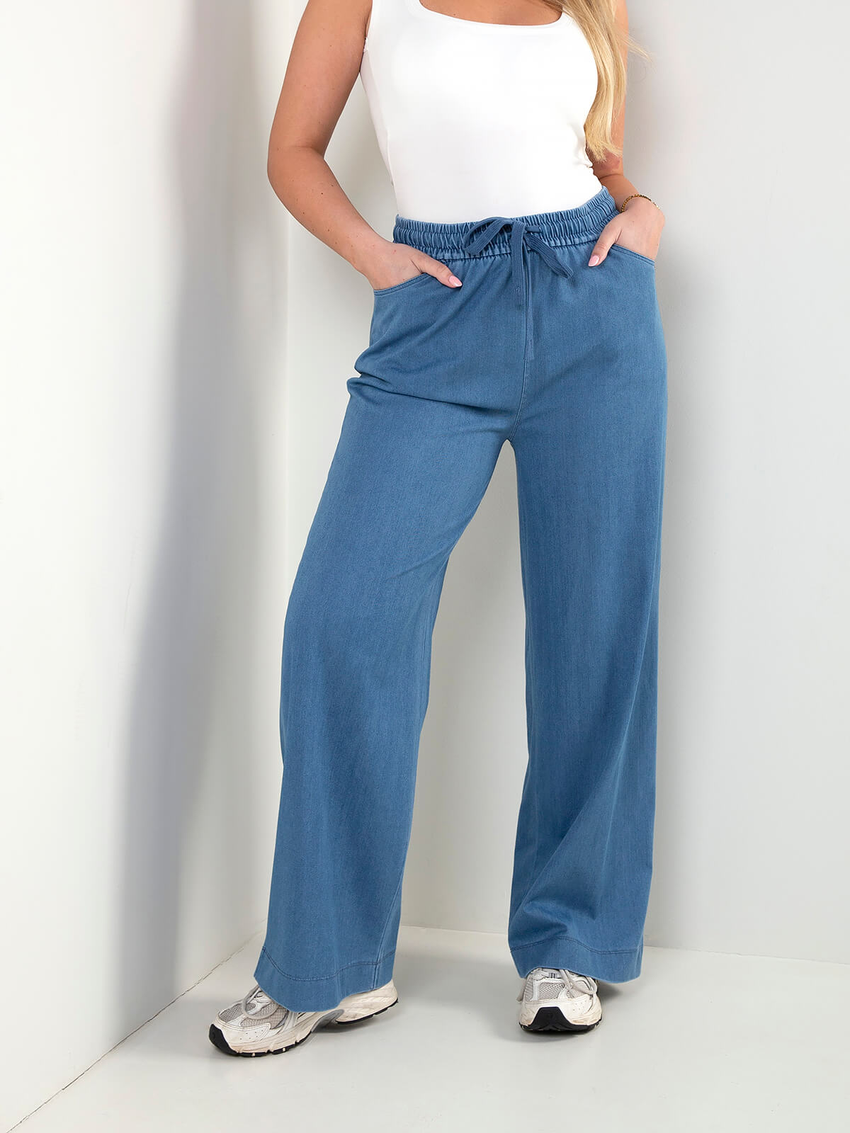 Calças largas efeito ganga com cintura elástica e cordão ajustável. Modelo de perna ampla com bolsos laterais. Tecido leve e confortável, ideal para looks casuais do dia a dia.