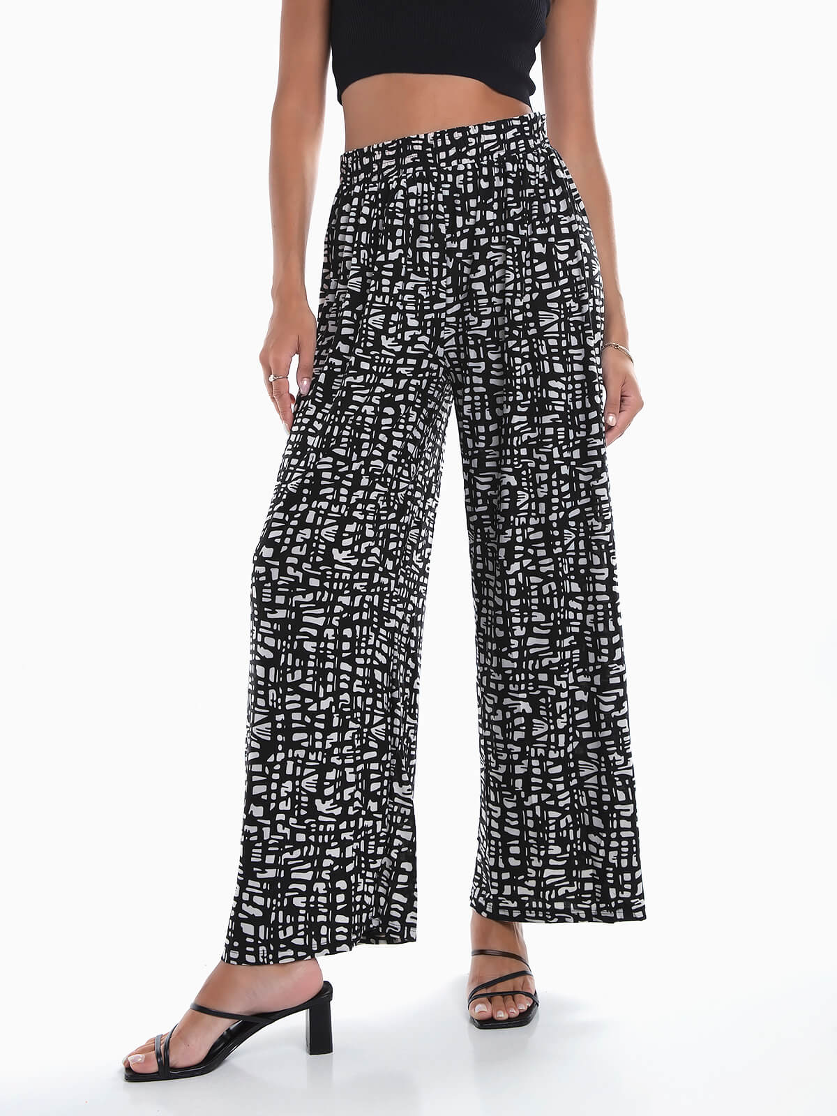 Calças largas com estampado abstrato para senhora. Calças em viscose para acabamento leve e fluído com cintura alta elástica.