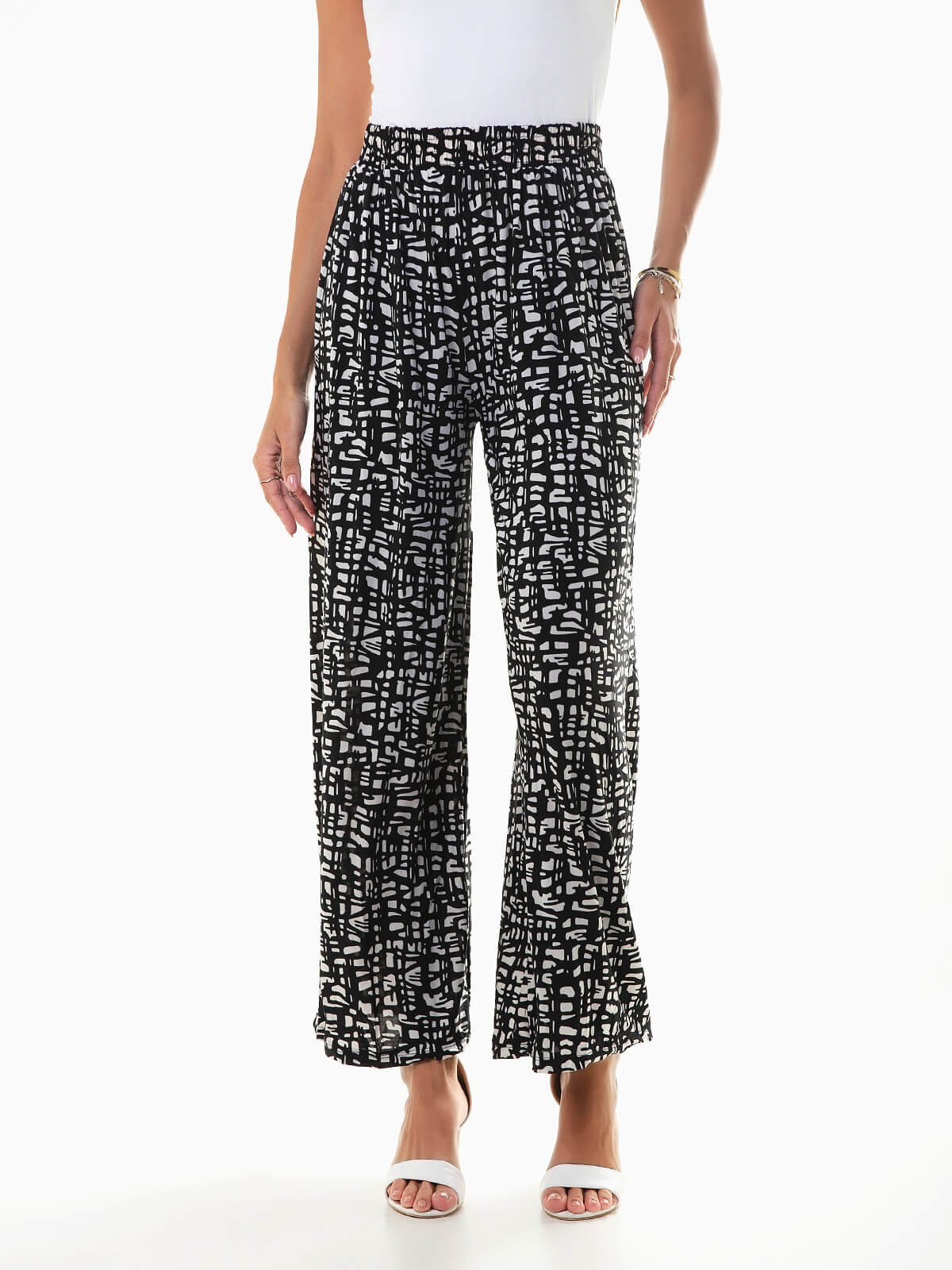 Calças largas com estampado abstrato para senhora. Calças em viscose para acabamento leve e fluído com cintura alta elástica.