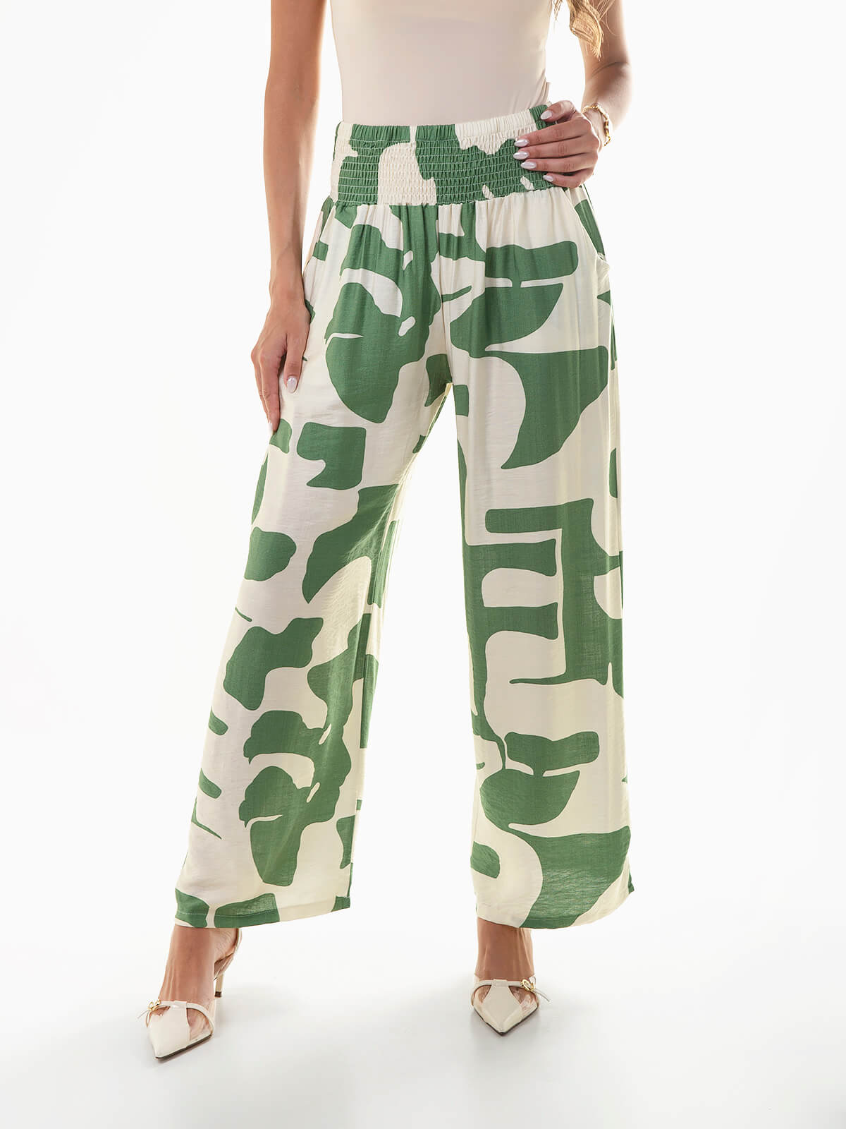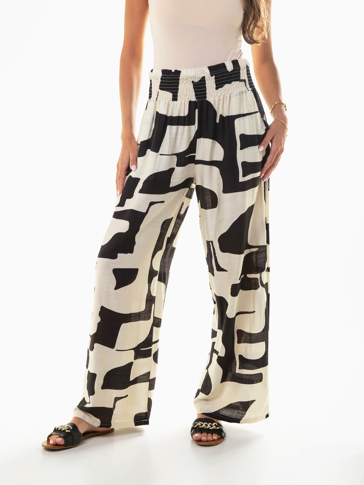 Calças com corte comprido e fluído, cintura subida e franzido smock elástico que se ajusta ao corpo. Estampado abstrato. Com 2 bolsos e com perna ampla, garantem conforto e leveza no dia a dia.