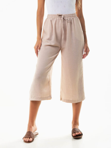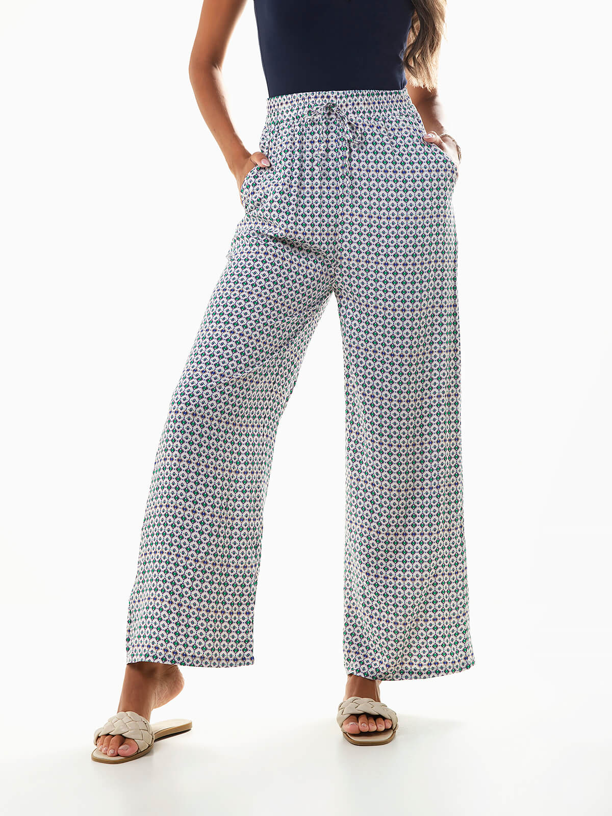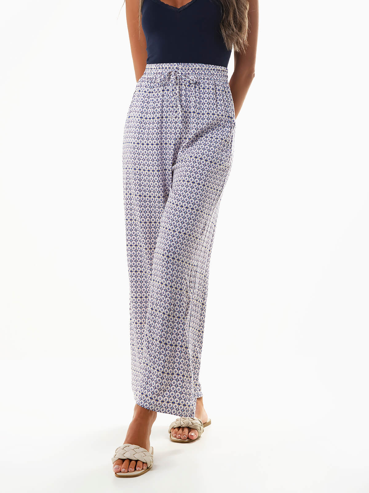Calças largas com estampado étnico para senhora. Calças de cintura alta elástica confecionadas em tecido 100% algodão para maior conforto. 2 bolsos e cordão para laço.
