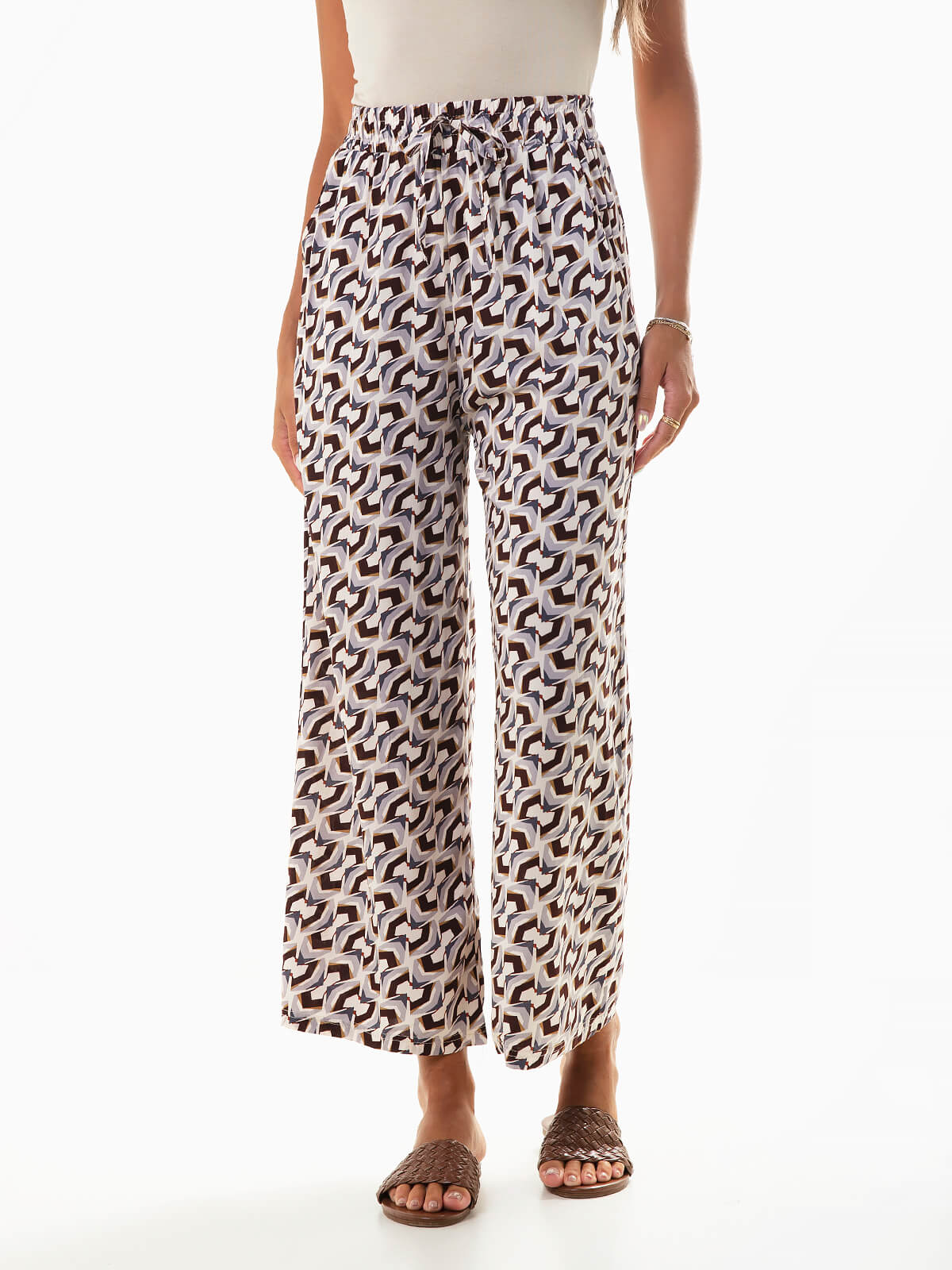 Calças largas com estampado geométrico para senhora. Calças de cintura alta elástica confecionadas em tecido 100% algodão para maior conforto. 2 bolsos e cordão para laço.