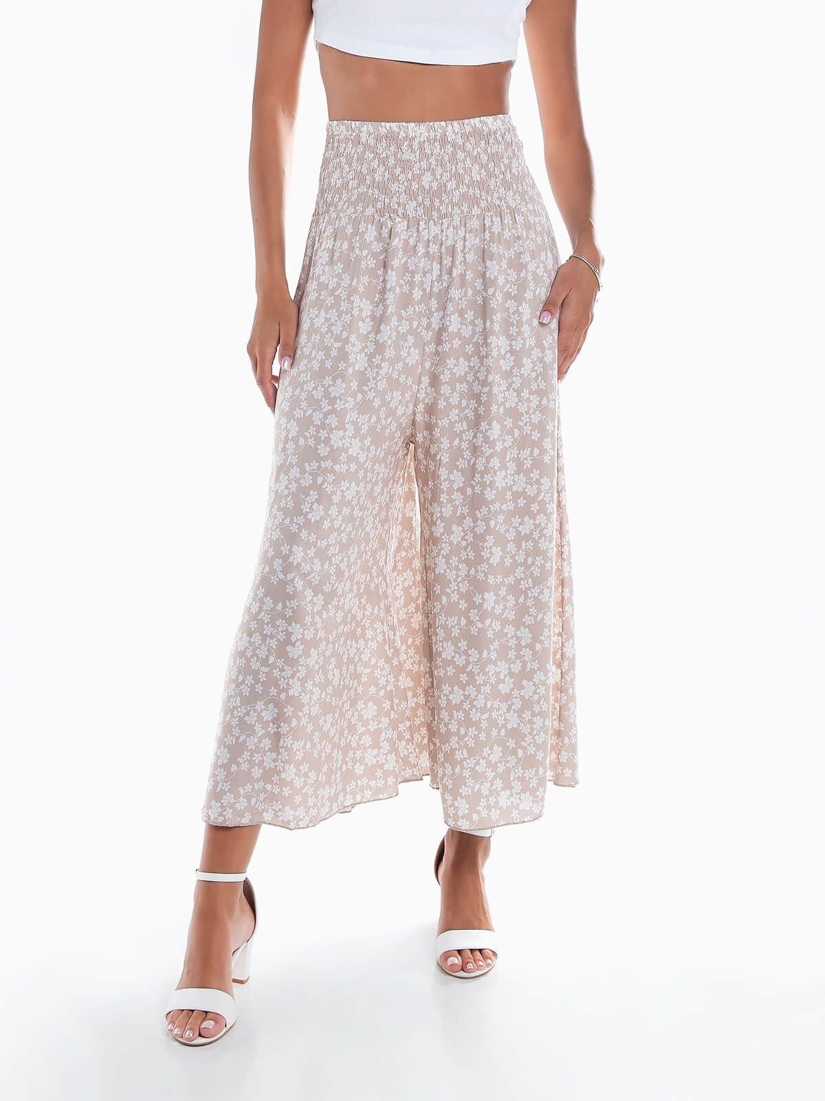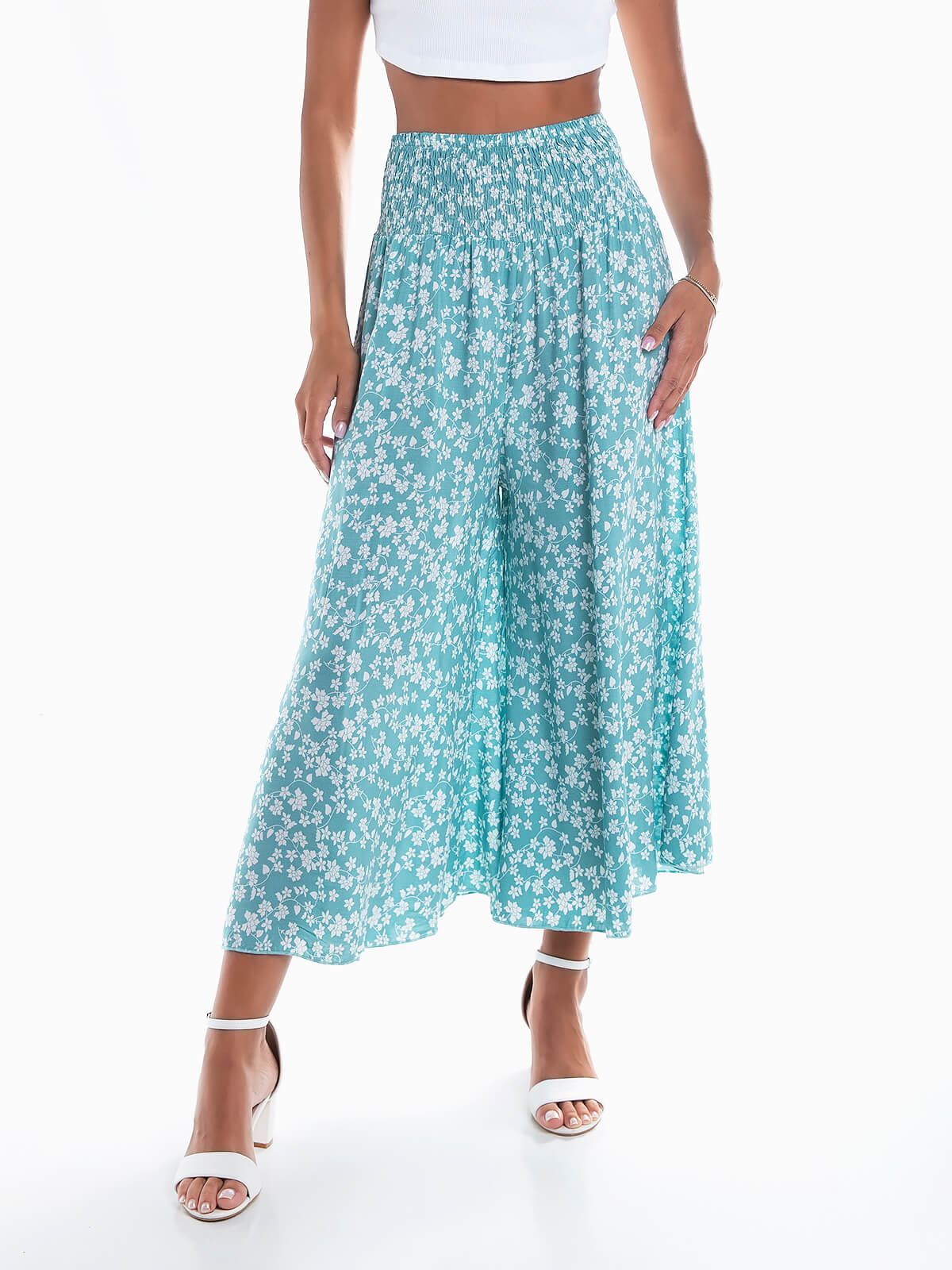 Calças largas floridas com cintura alta em franzido smock. Culottes em tecido 100% algodão.