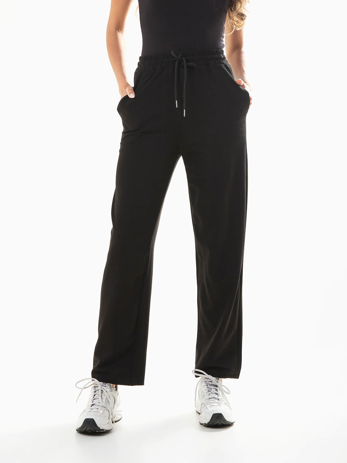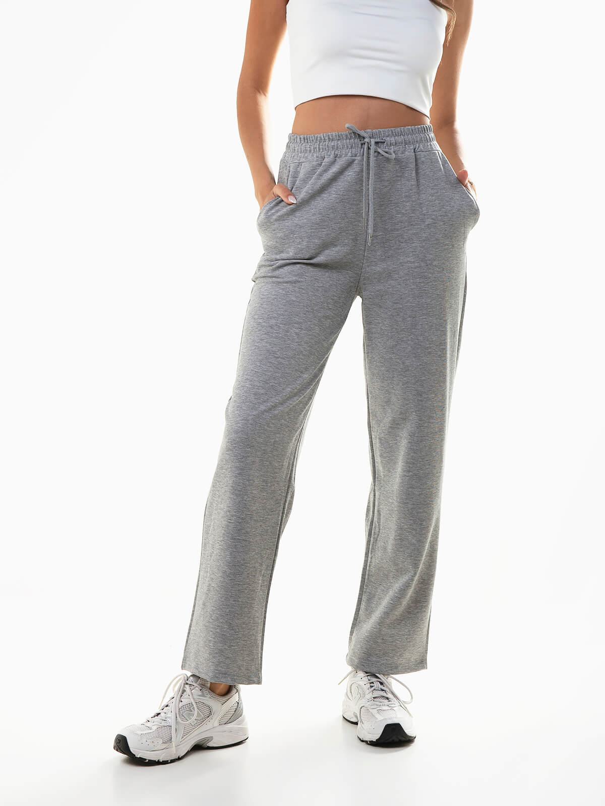 Calças largas em malha com efeito canelado fino. Calças desportivas para mulher com cintura alta e cordão para ajustar. 2 bolsos.