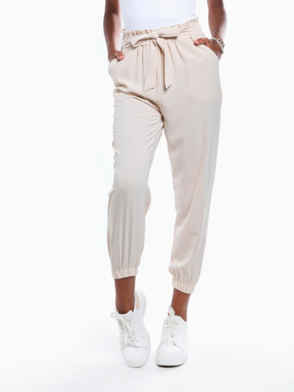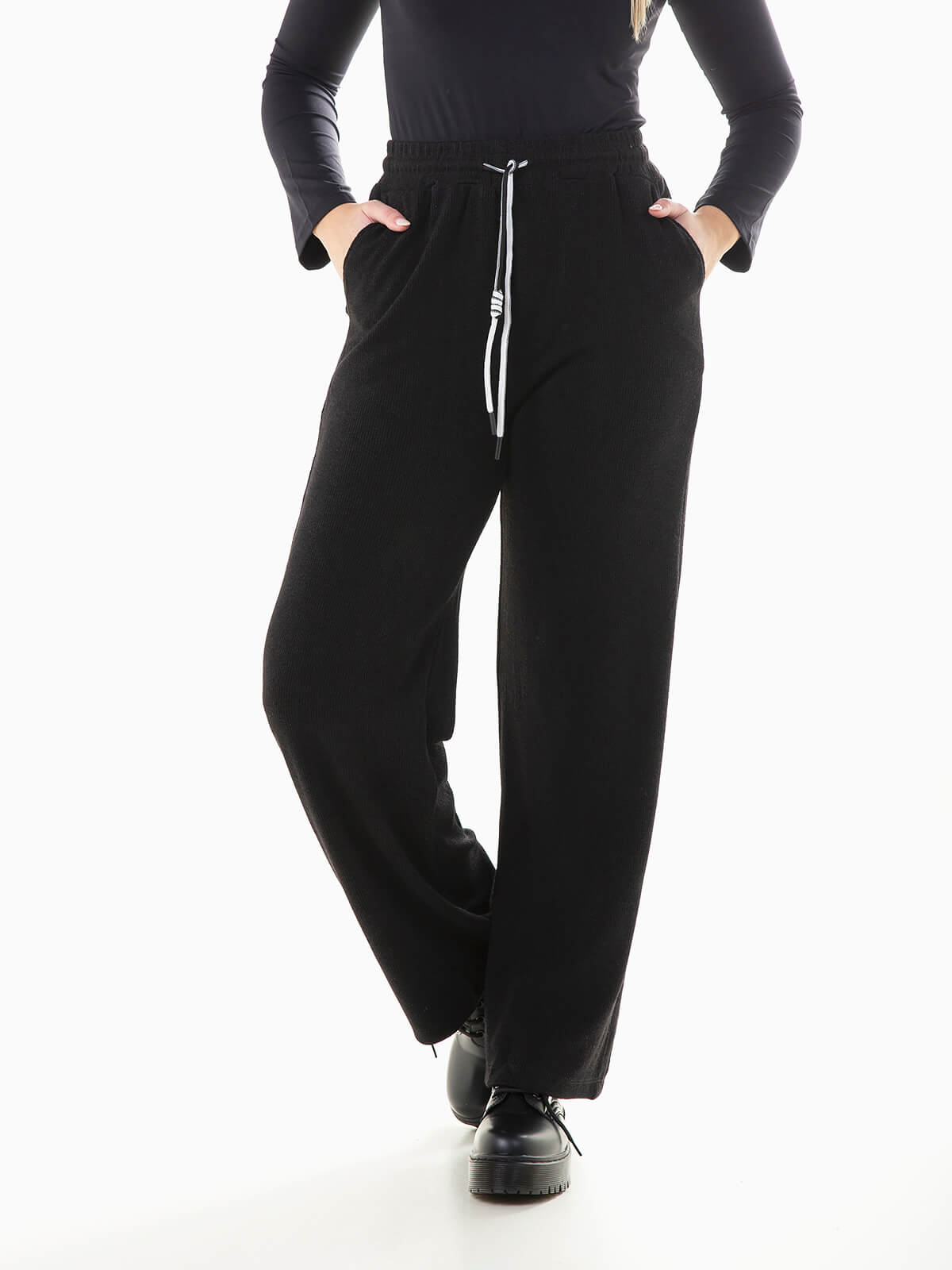 Calças largas em malha canelada com 2 bolsos laterais. Calças para mulher de cintura alta com cordão bicolor em contraste para ajustar.