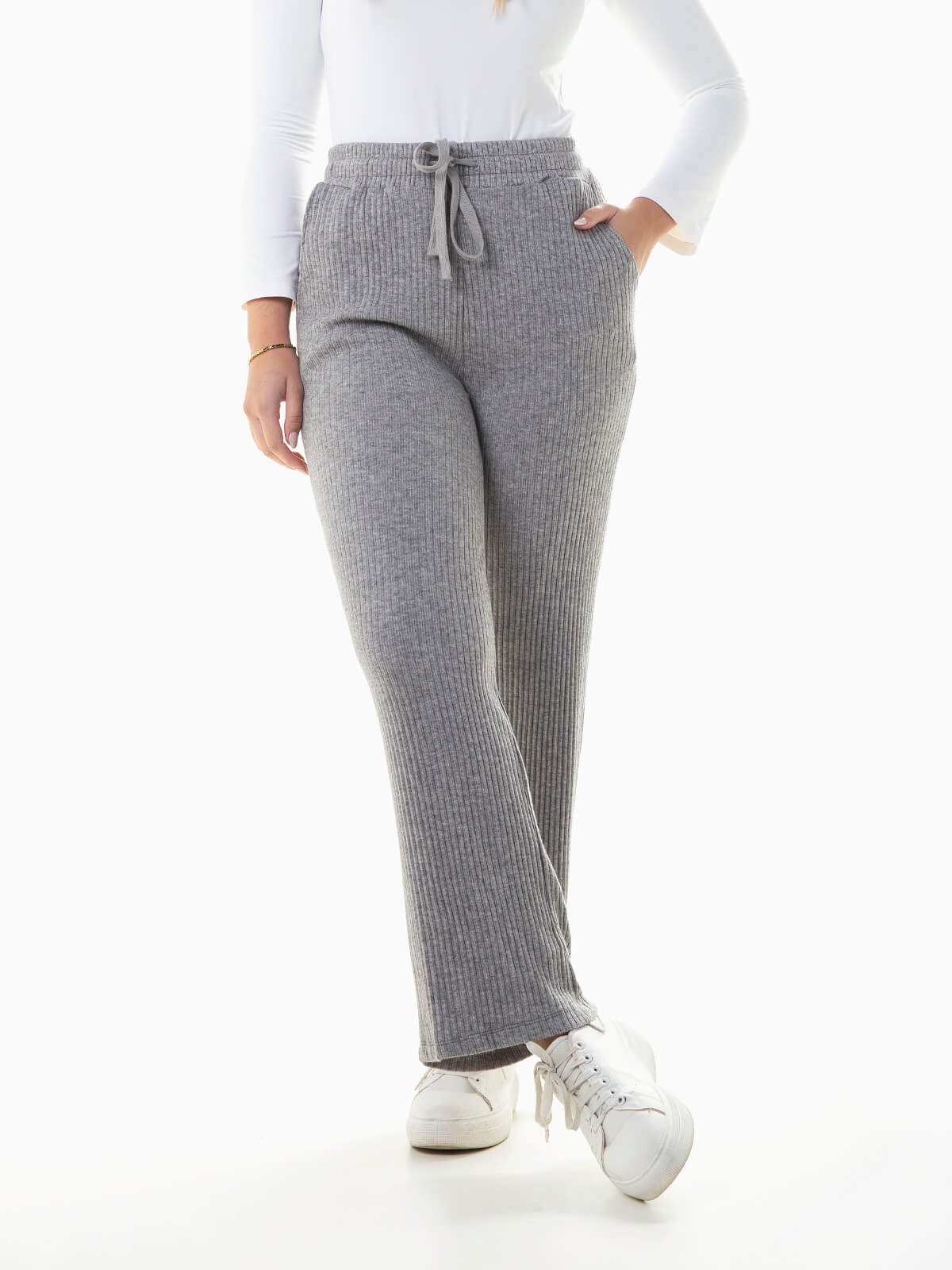 Calças largas em malha canelada mesclada para senhora. Calças de cintura alta com cordão para ajustar. 2 bolsos. Sem carda.