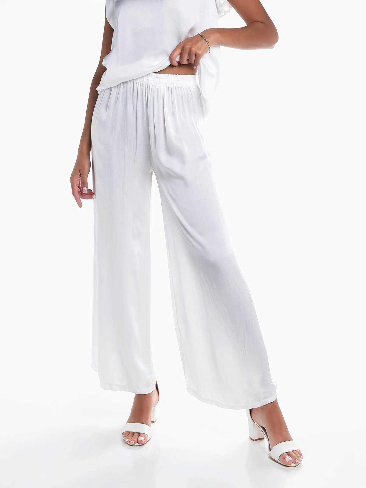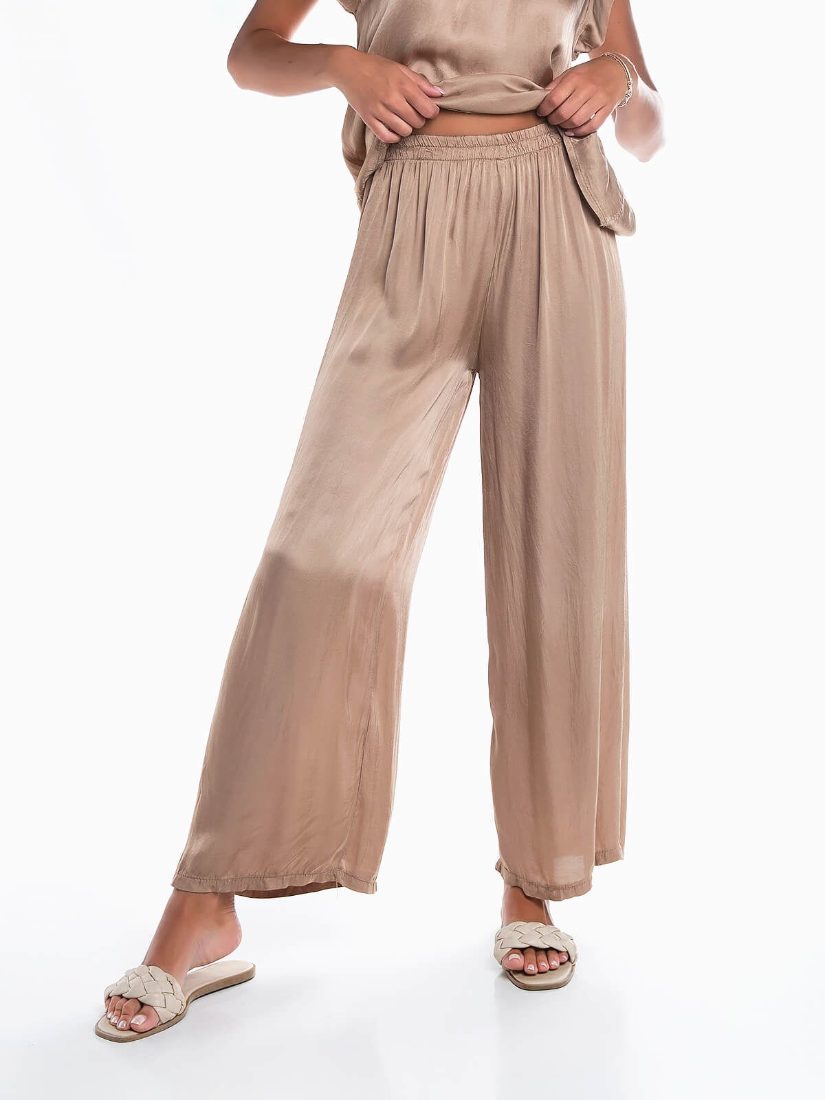 Calças largas em cetim com mistura de seda. Calças fluídas de cintura alta elástica.