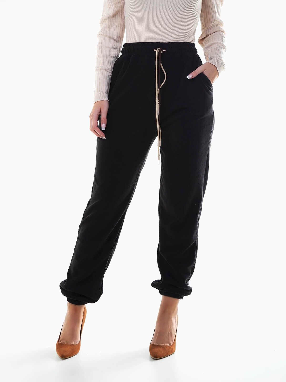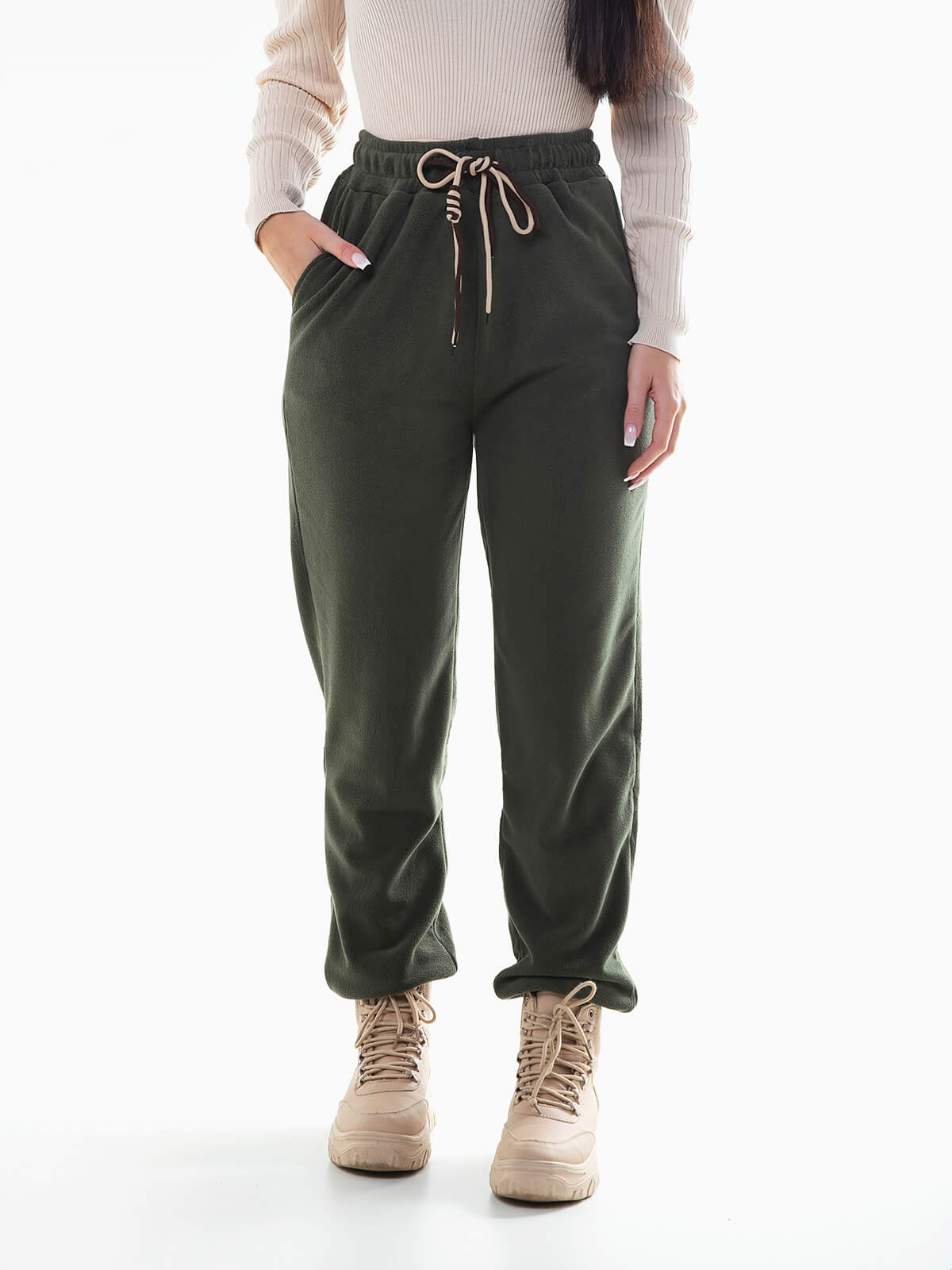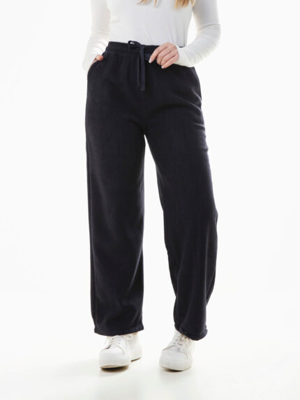 Calças largas em tecido polar para senhora. Calças cintura alta elástica com cordão para ajustar. 2 bolsos.