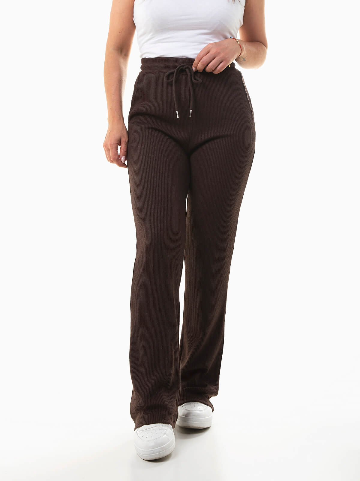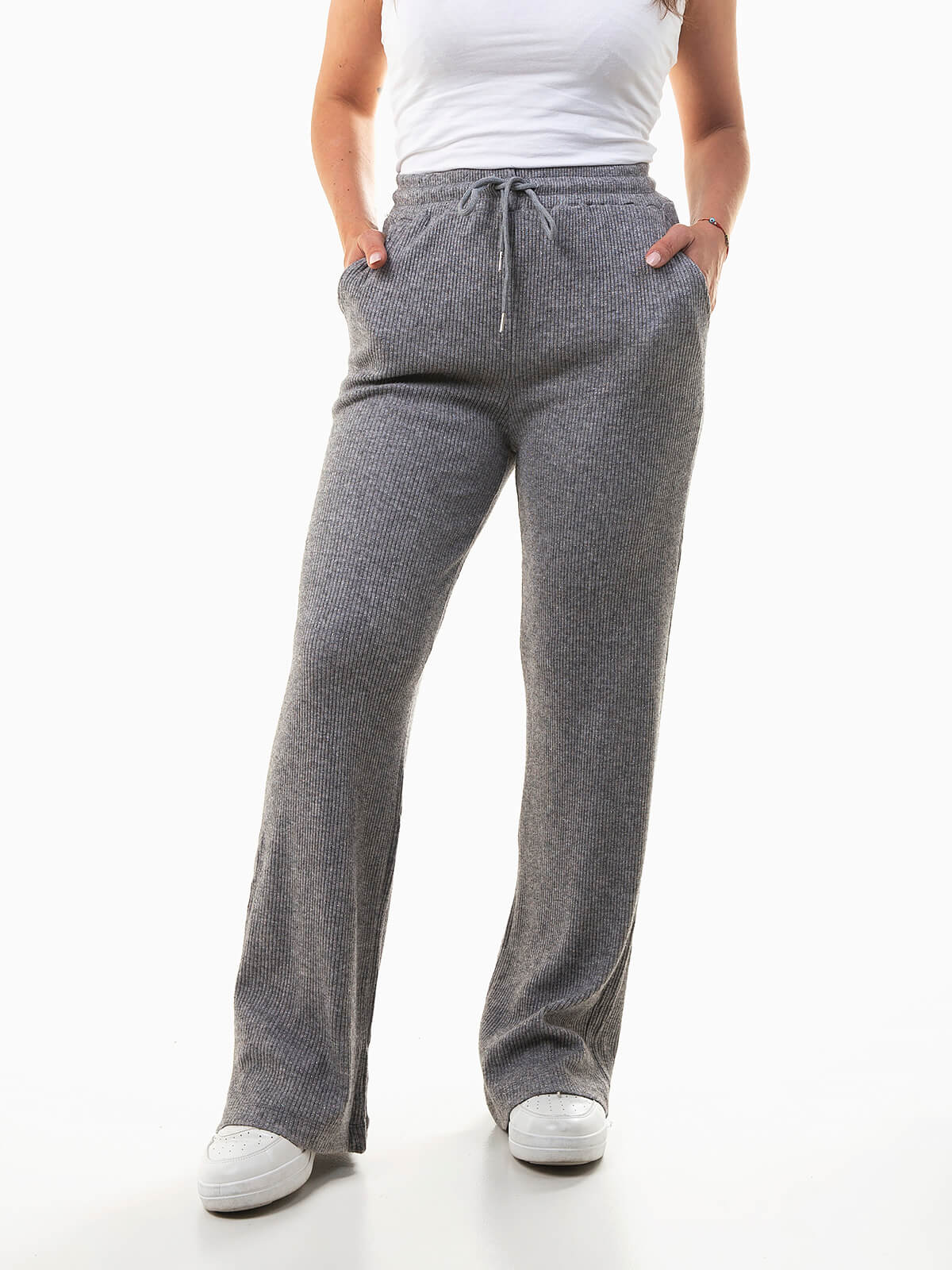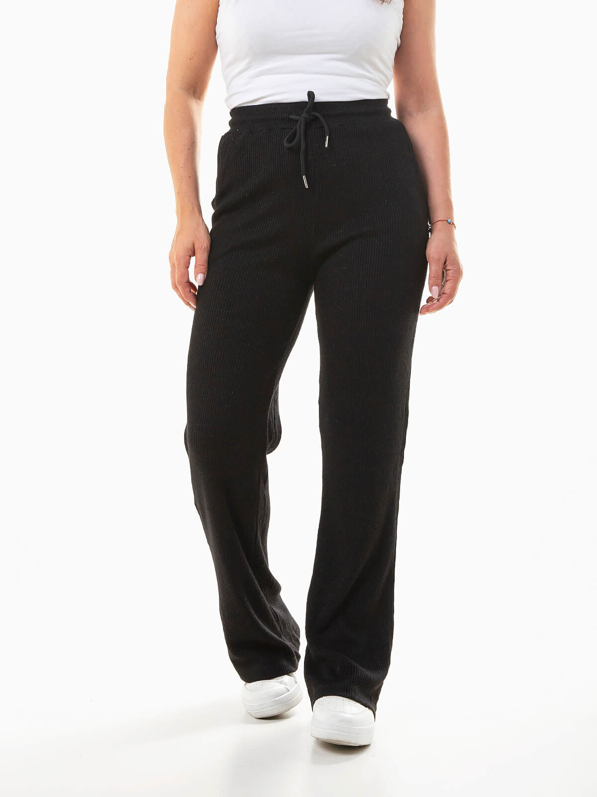 Calças de malha canelada com brilho, cintura alta ajustável com cordão e dois bolsos. Confortáveis e modernas, ideais para looks casuais ou descontraídos.