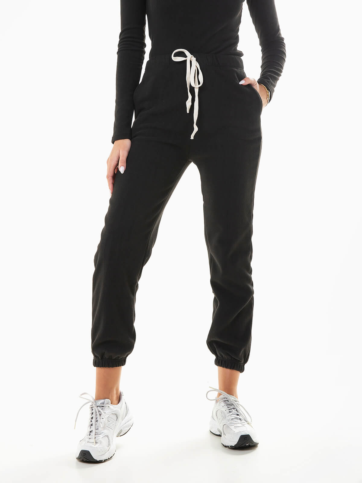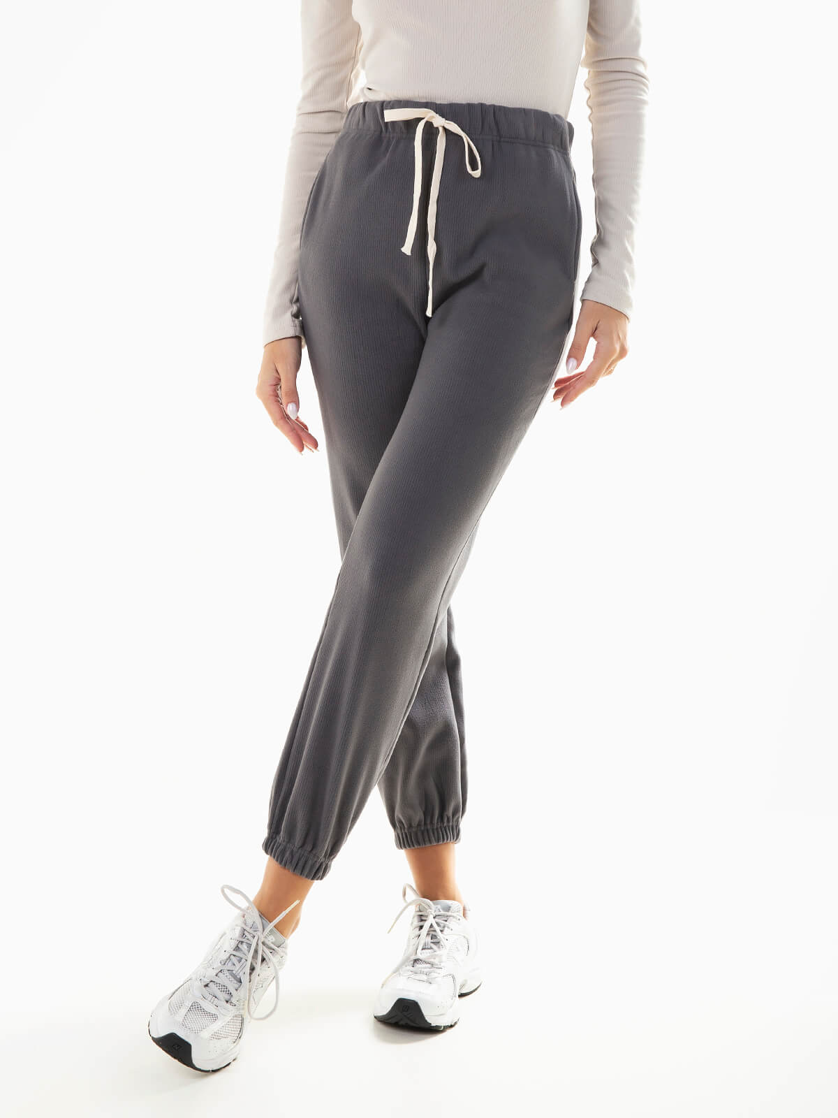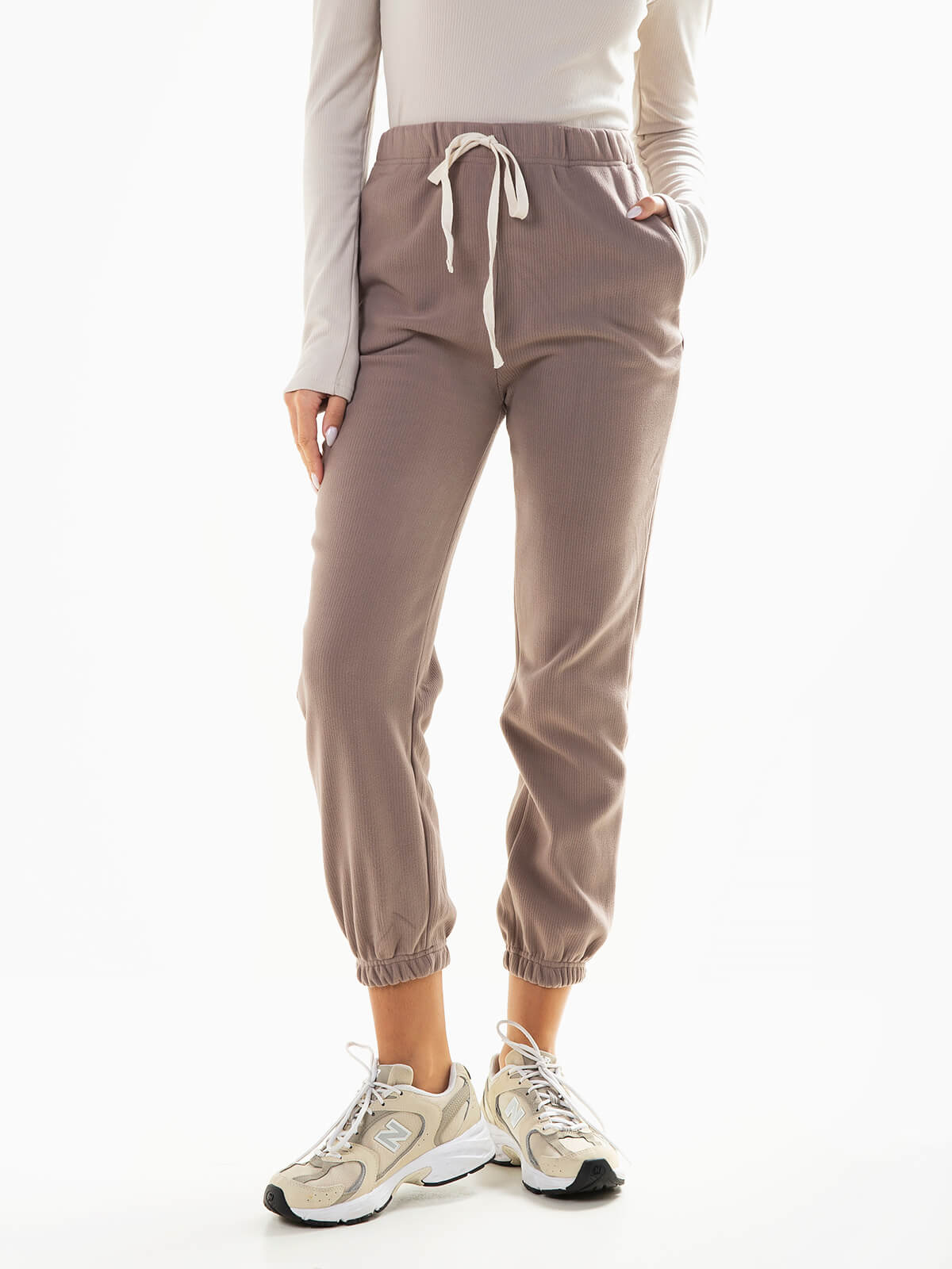 Calças em malha canelada com interior cardado e 2 bolsos. Calças jogger desportivas com cintura alta elástica e cordão para laço.
