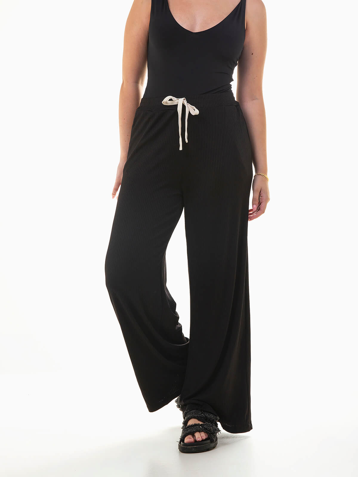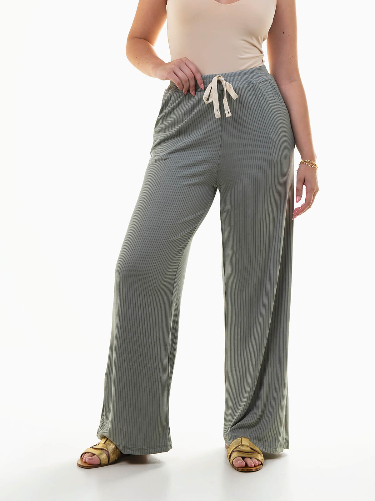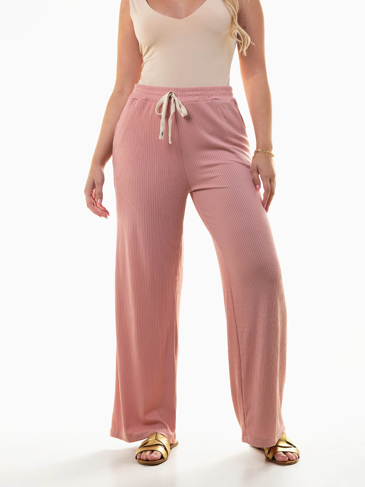 Calças em malha canelada com cintura alta e corte fluído. 2 bolsos laterais e cordão na cintura para laço. Confortáveis e versáteis, adaptam-se facilmente a looks descontraídos ou mais urbanos.