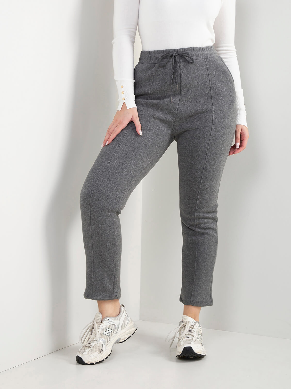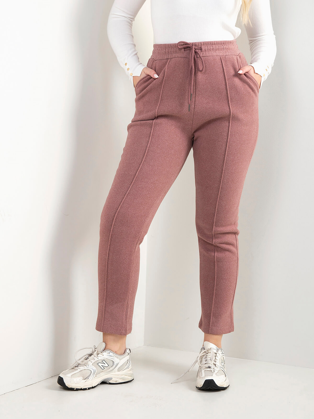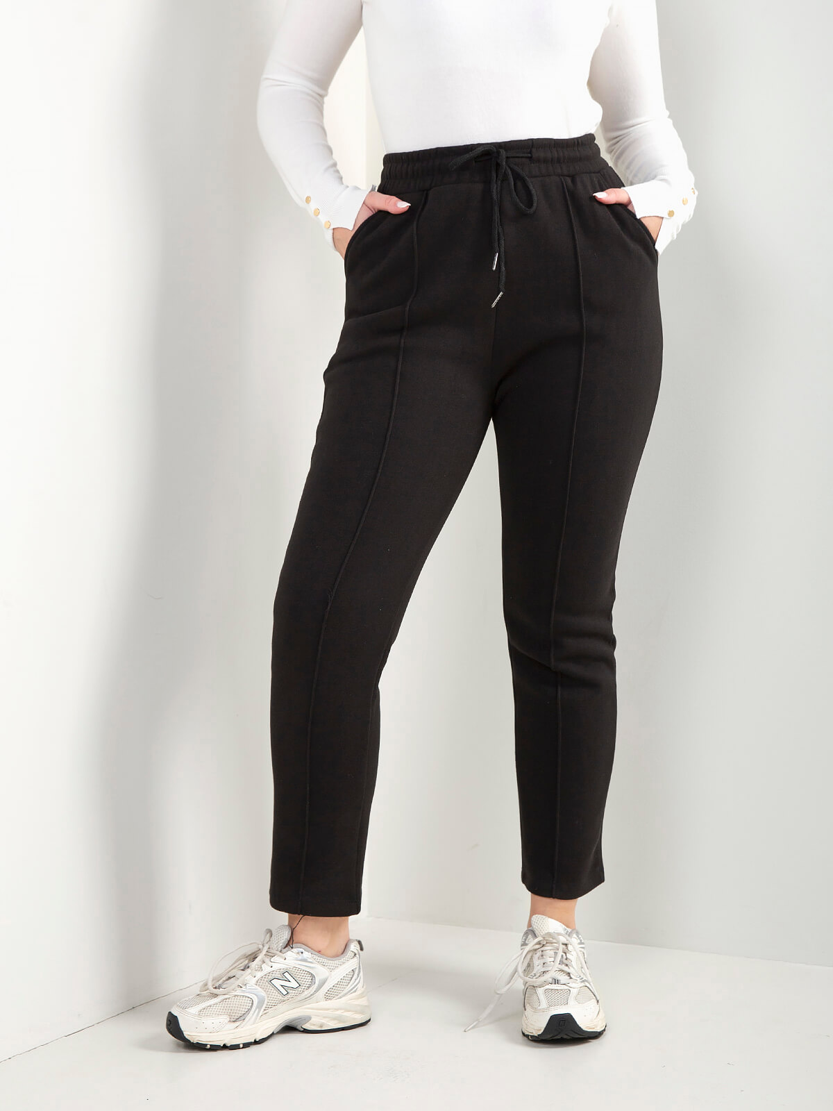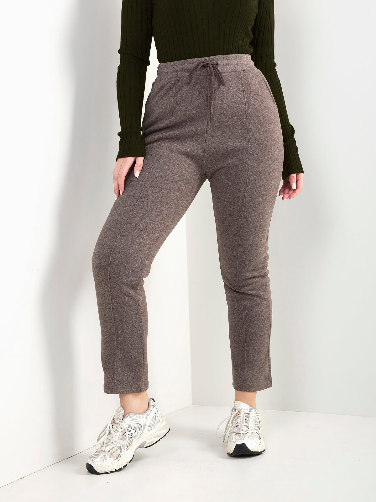 Calças de malha laminada com cintura alta, pinças frontais e cordão para ajustar. Têm interior cardado e 2 bolsos, perfeitas para um look confortável e atual no dia a dia.