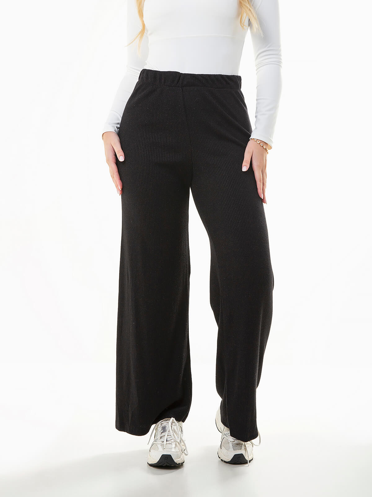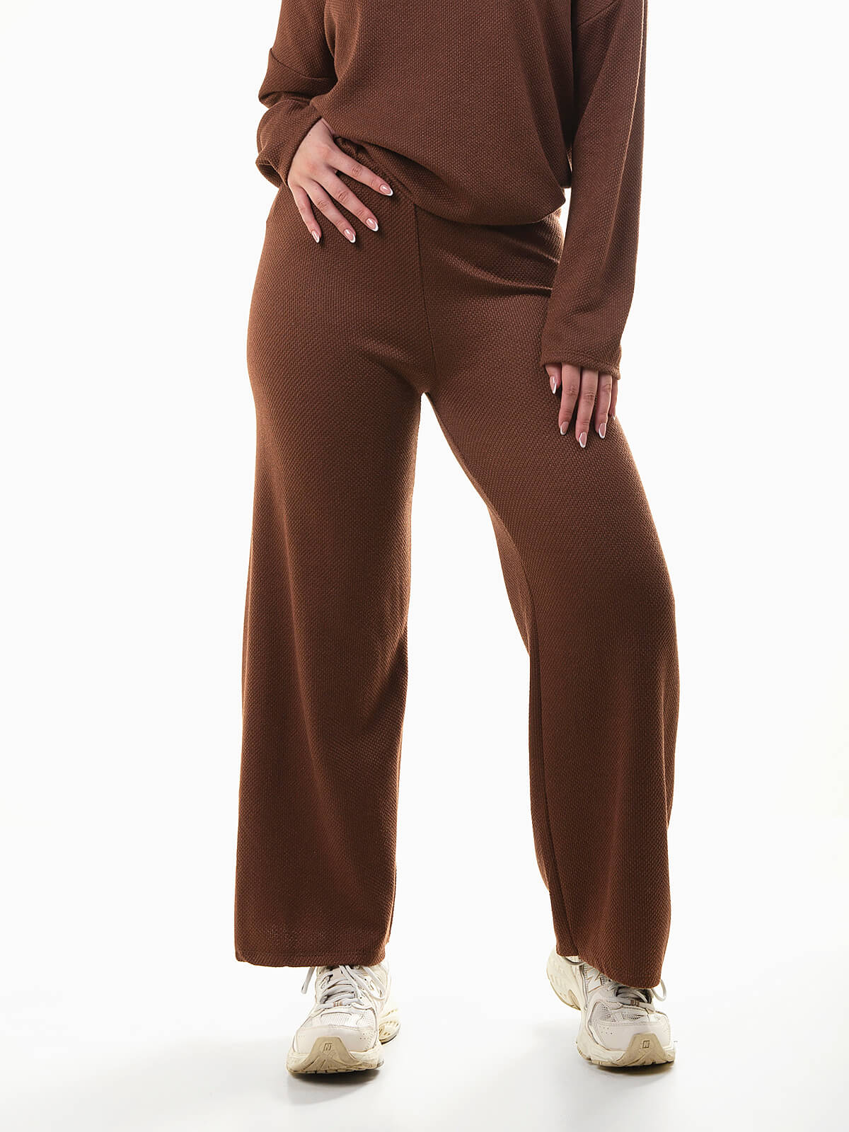 Calças de malha com textura e efeito brilhante. Modelo de cintura alta com cós elástico, confortável e moderno. Uma peça versátil e elegante que combina estilo e praticidade no dia a dia. Perfeitas para conjugar com a camisola a combinar para um look coordenado e sofisticado.