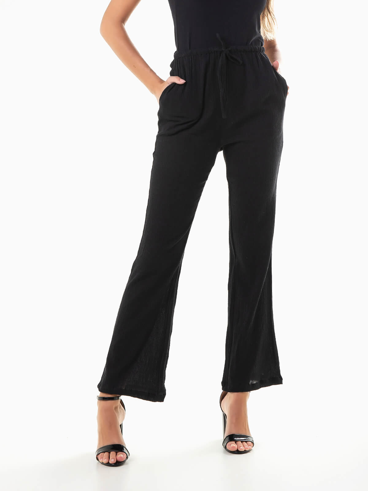 Calças em malha crepe 100% algodão confortáveis e frescas. Calças de cintura alta com cordão na cintura para ajustar. 2 bolsos.