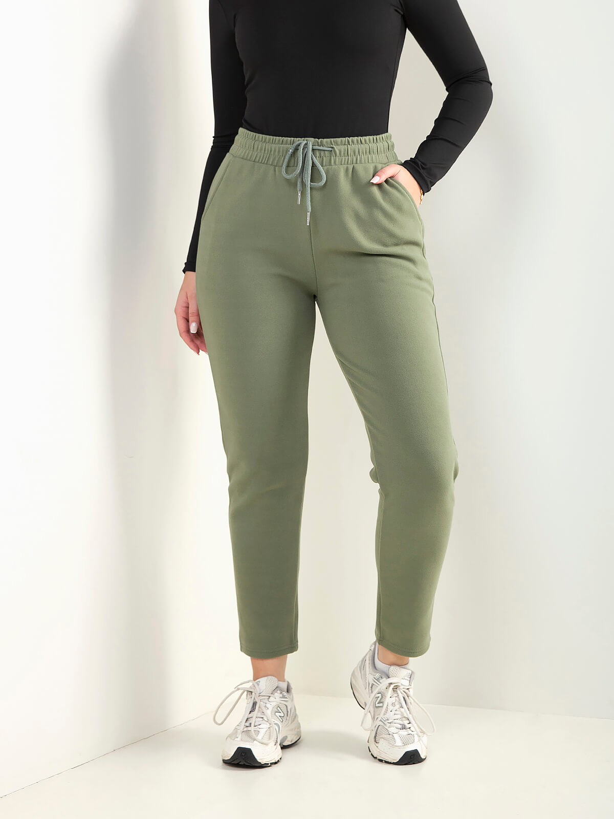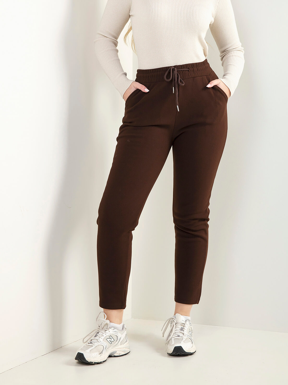 Calças de malha com efeito pêssego, cintura alta e cordão para ajustar. Interior suave e confortável, modelo prático para o dia a dia e perfeito para looks descontraídos. Com bolsos laterais.