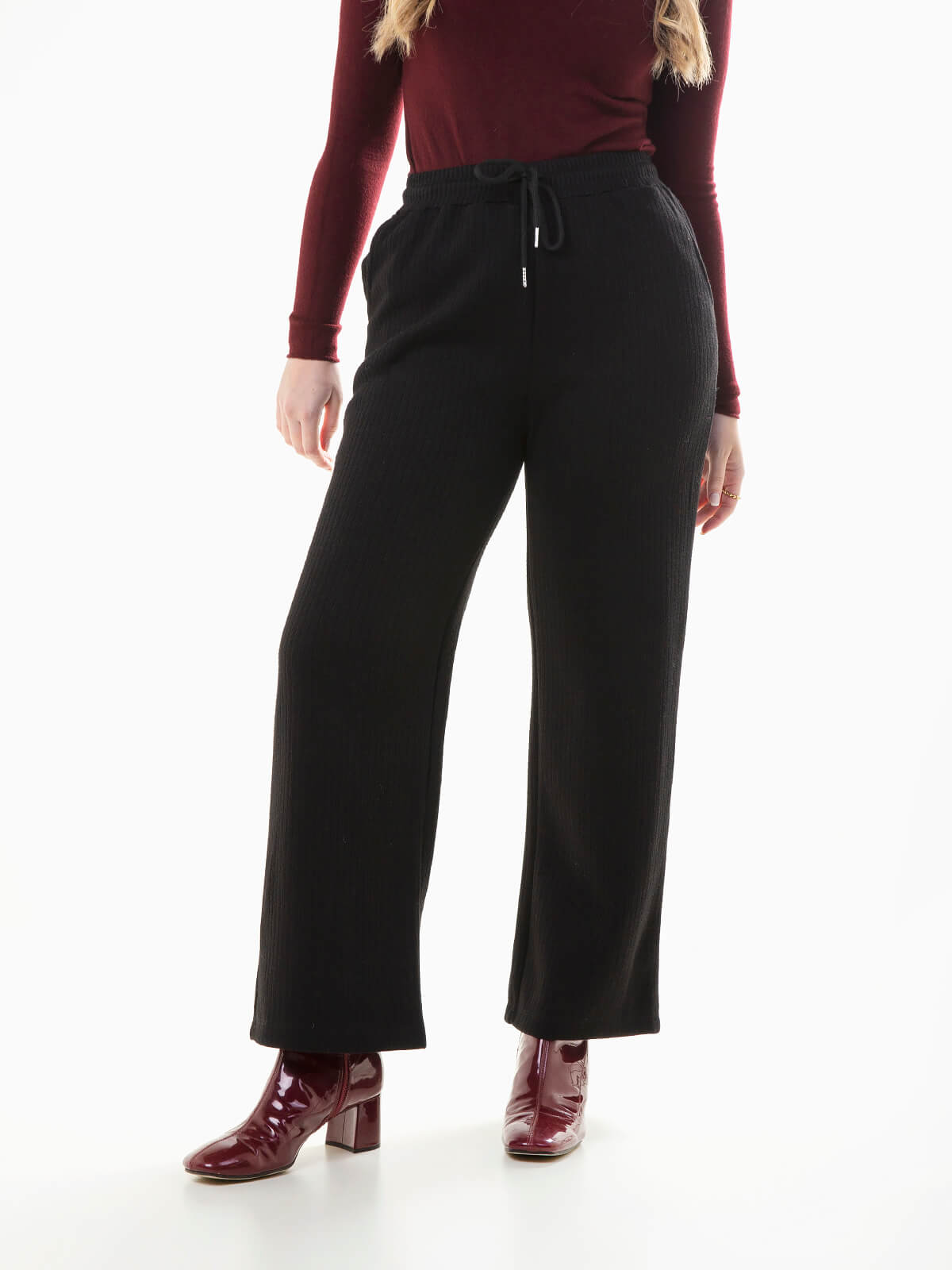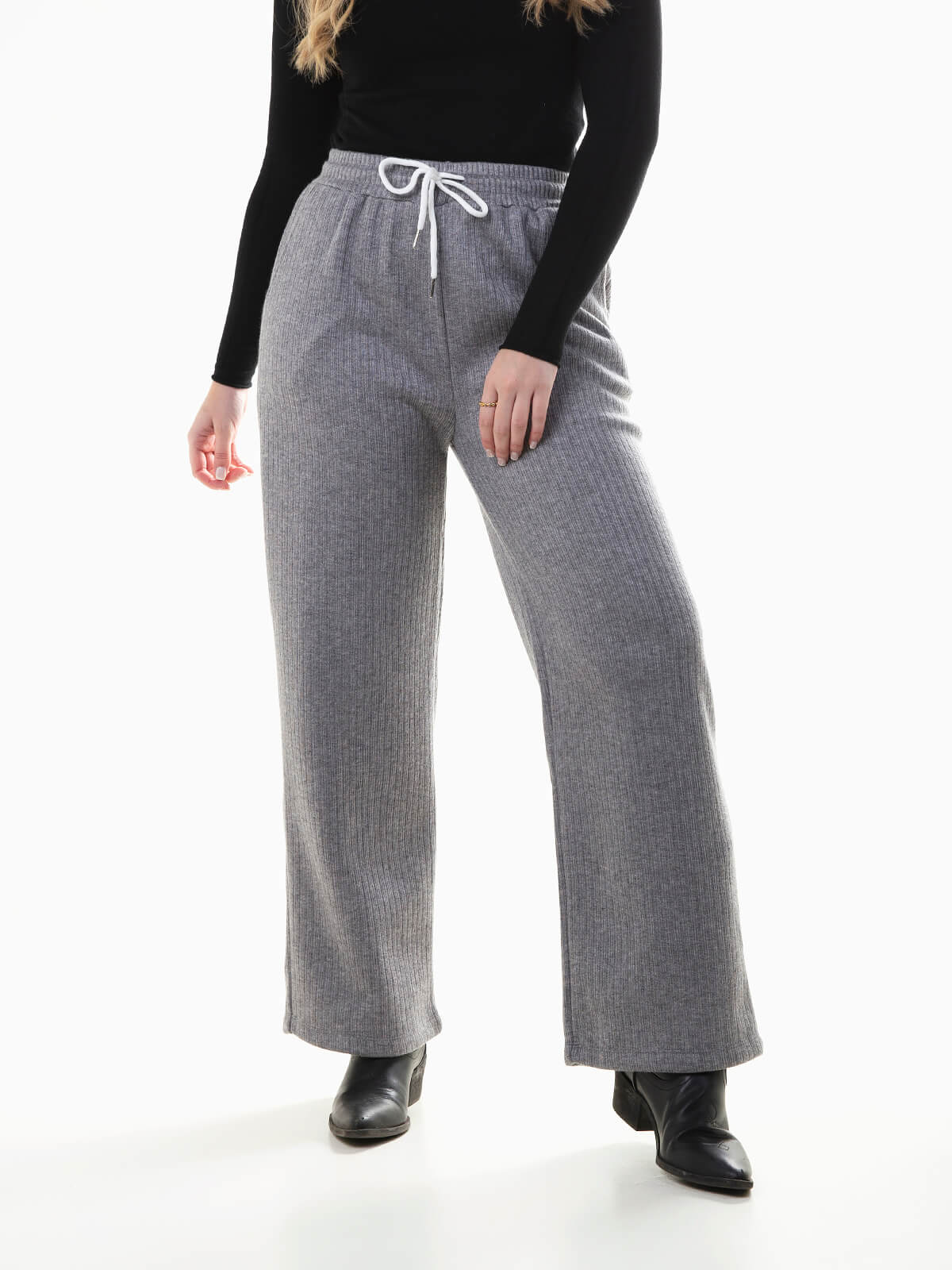 Calças largas de malha canelada com interior cardado para mulher. Calças de cintura alta com cordão para ajustar. 2 bolsos.