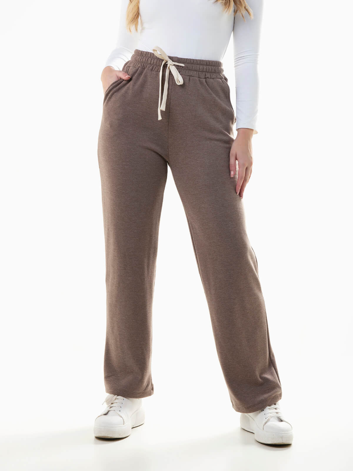 Calças de malha mesclada com interior polar para senhora. Calças largas de cintura alta com cordão para ajustar. 2 bolsos.