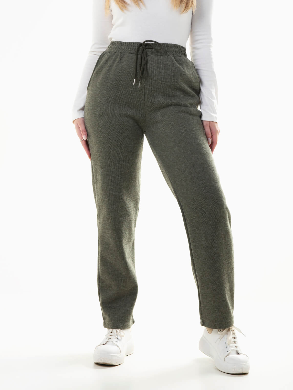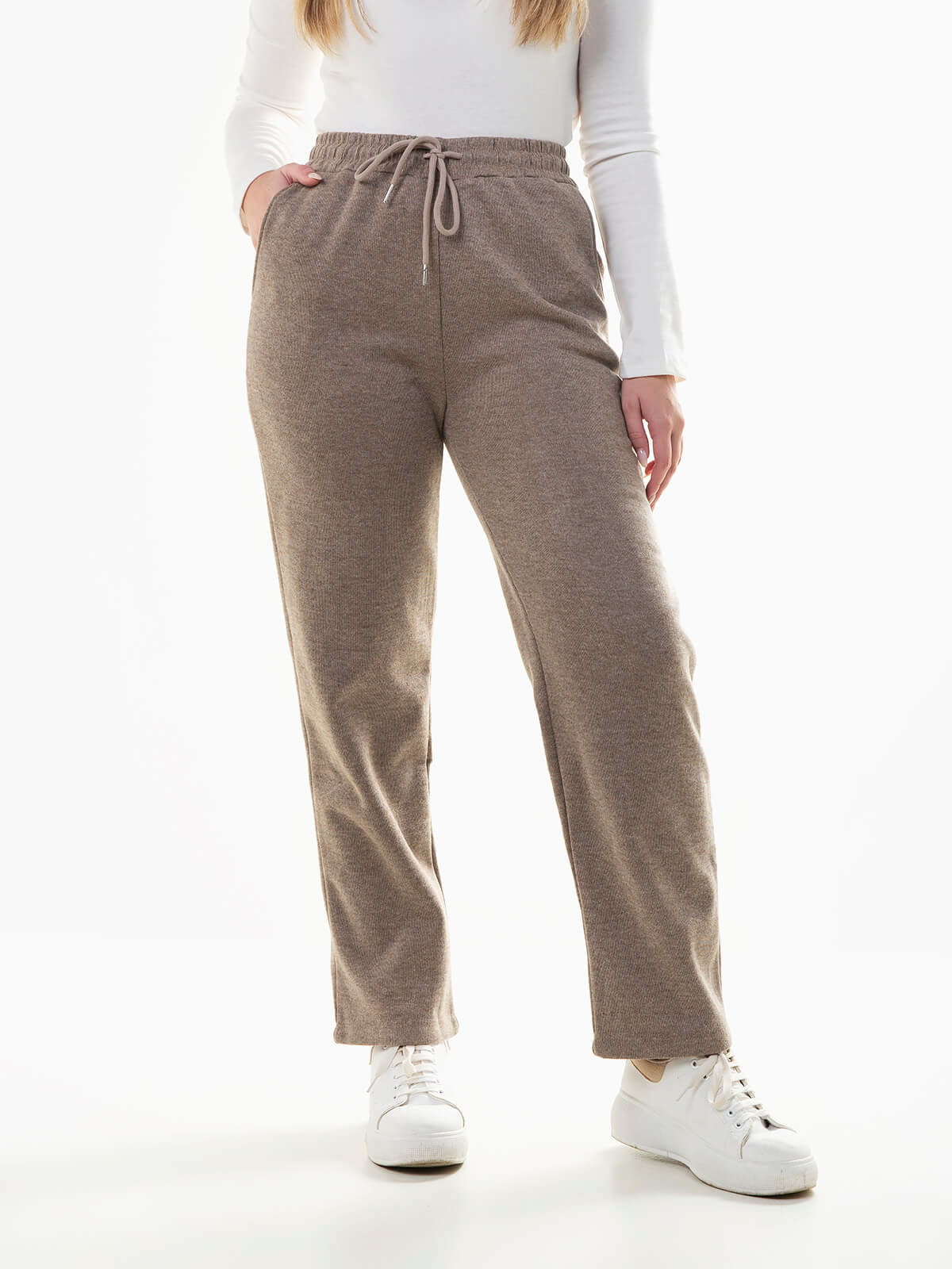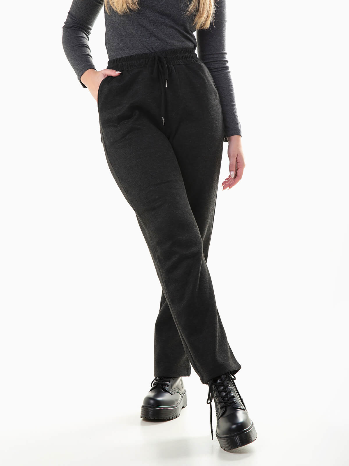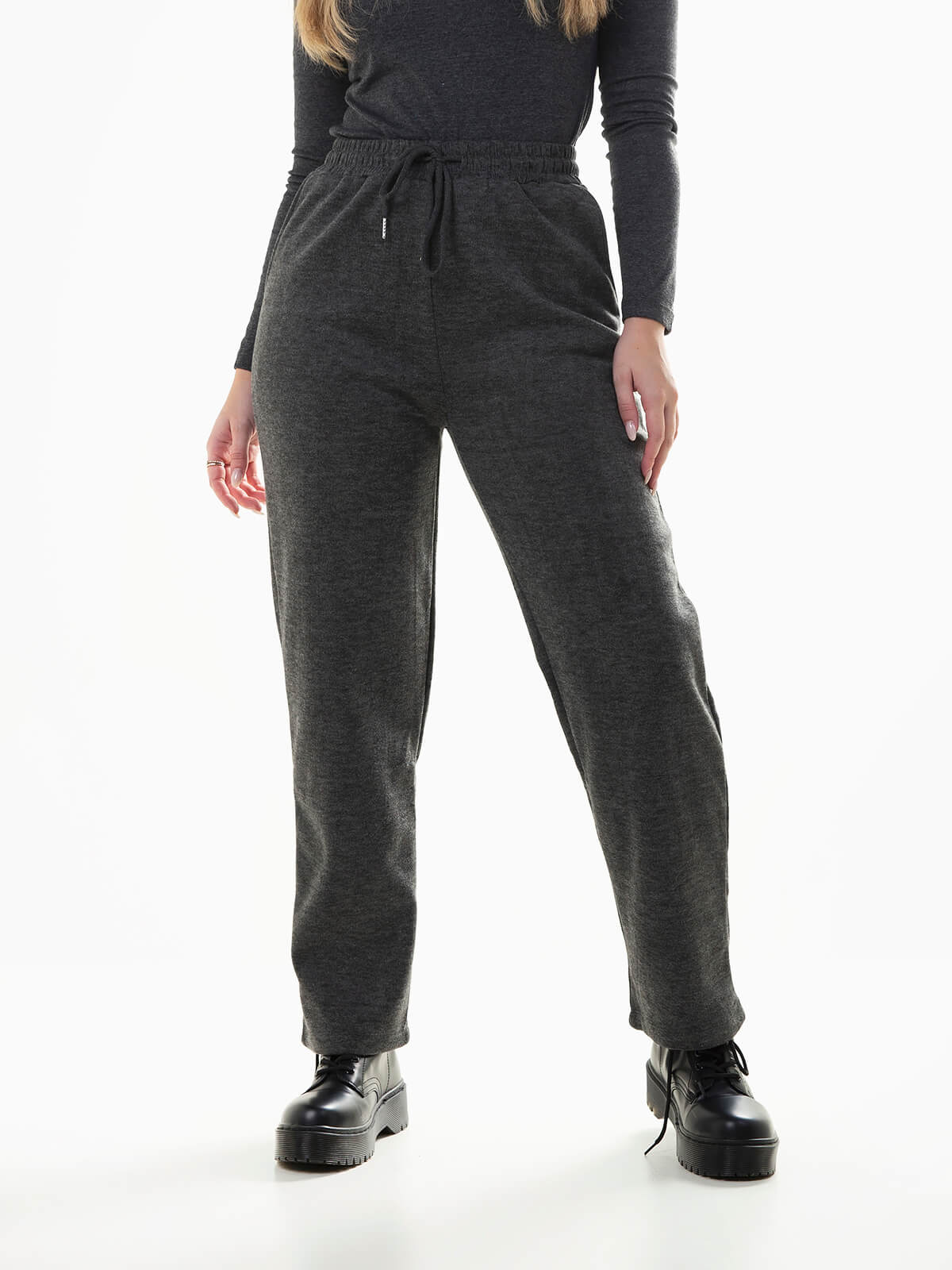 Calças de malha mesclada com interior cardado para senhora. Calças largas de cintura alta com cordão para ajustar. 4 bolsos.