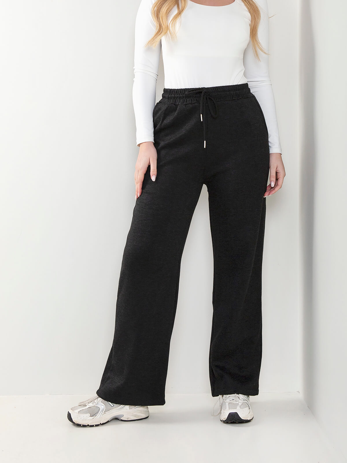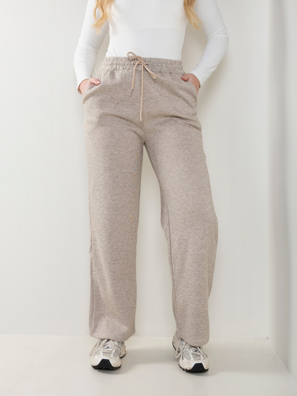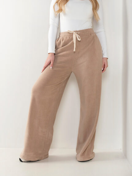 Calças de malha nervurada com interior cardado para senhora. Calças largas de cintura alta com cordão para ajustar. 4 bolsos.