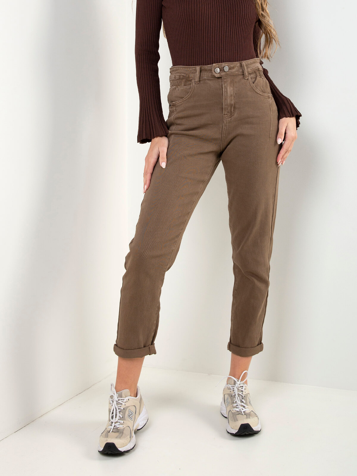 Calças de ganga mom fit com dobra na base para mulher. Jeans de cintura alta com cós elástico nas laterais para maior conforto. Aperto com botões metálicos e fecho de correr. 4 bolsos. Costuras reforçadas.