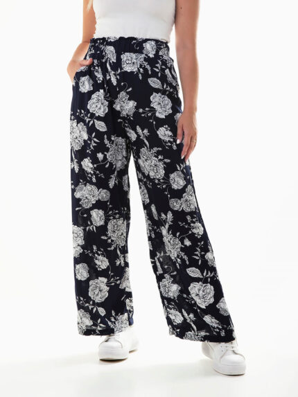 Calças palazzo de cintura alta elástica para senhora. Calças com estampado abstrato colorido em tecido 100% algodão.