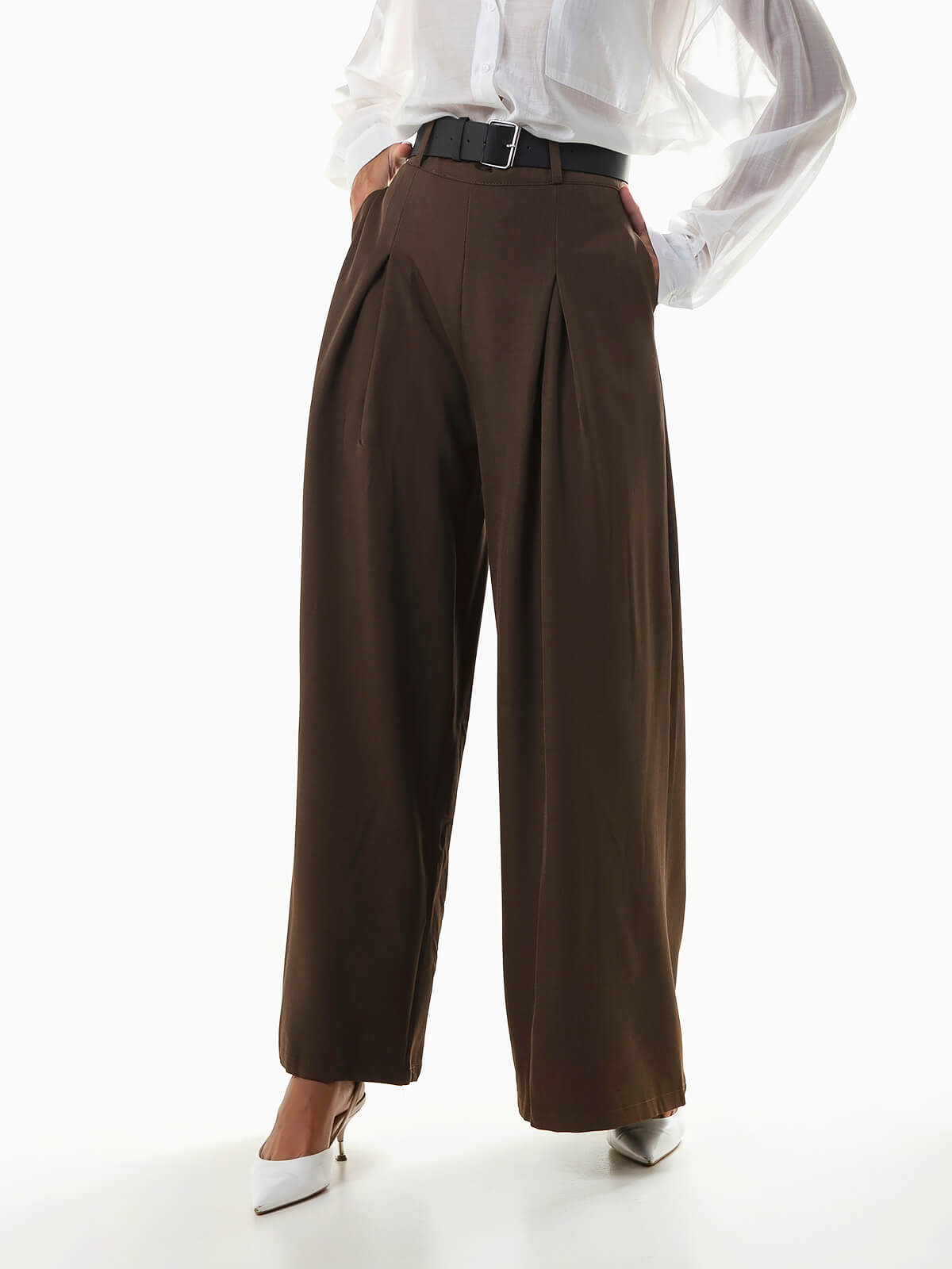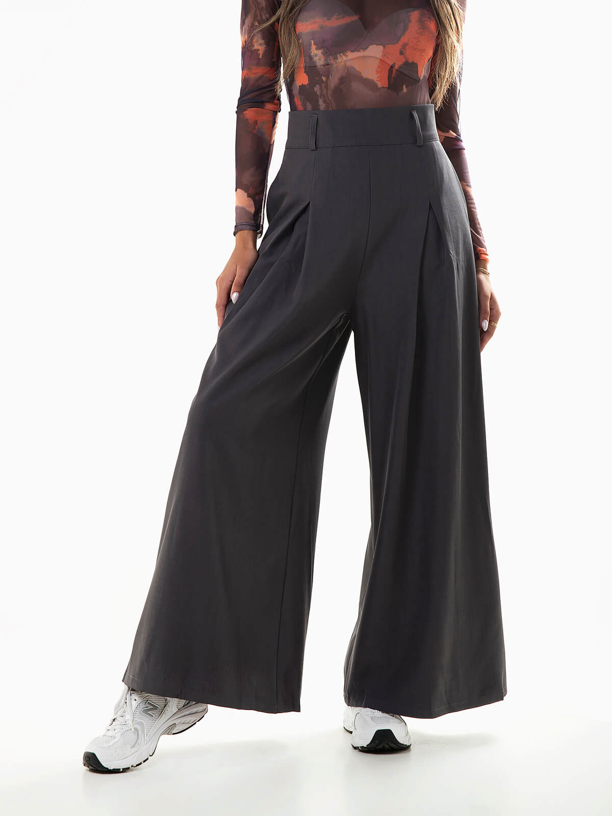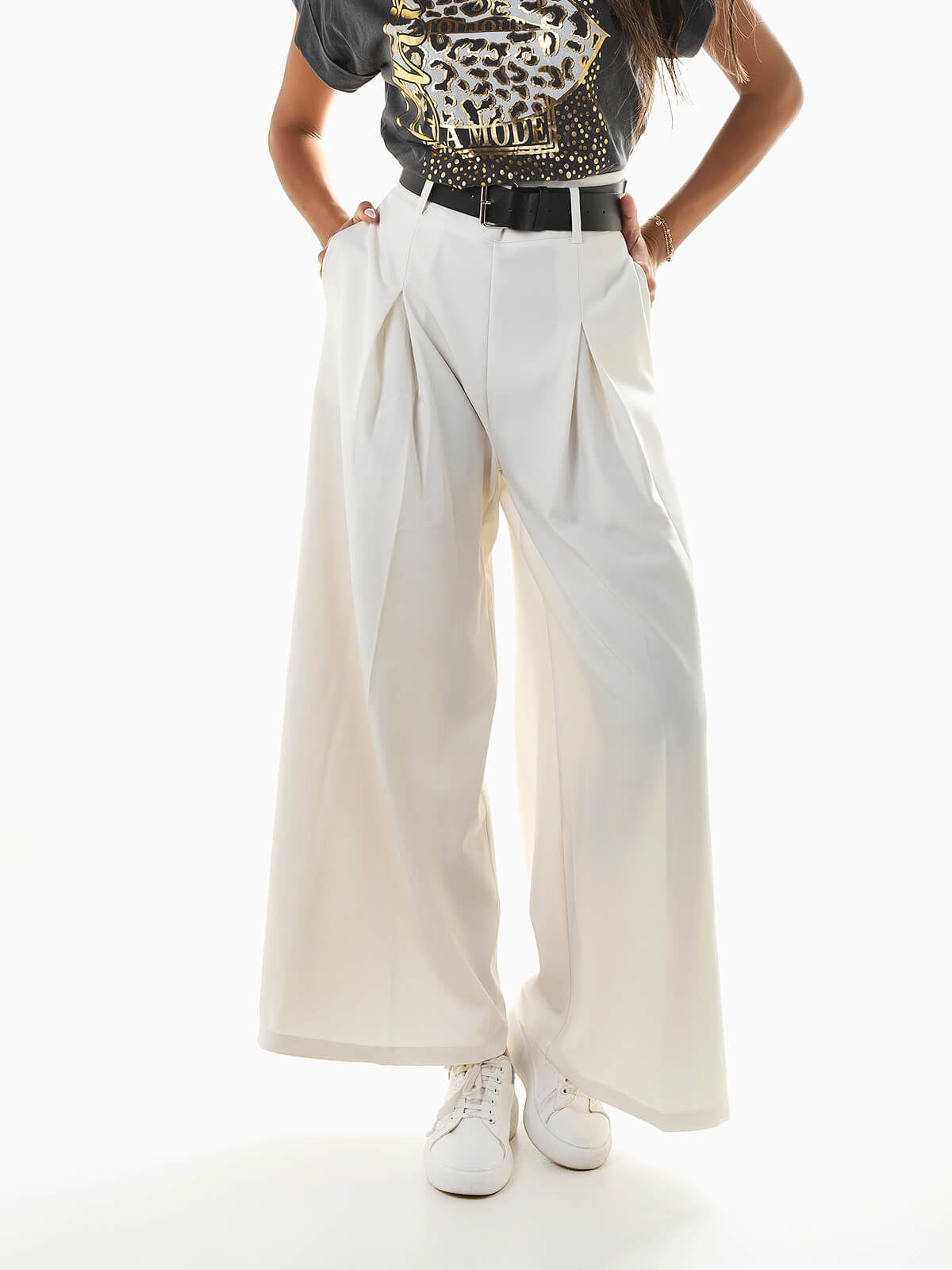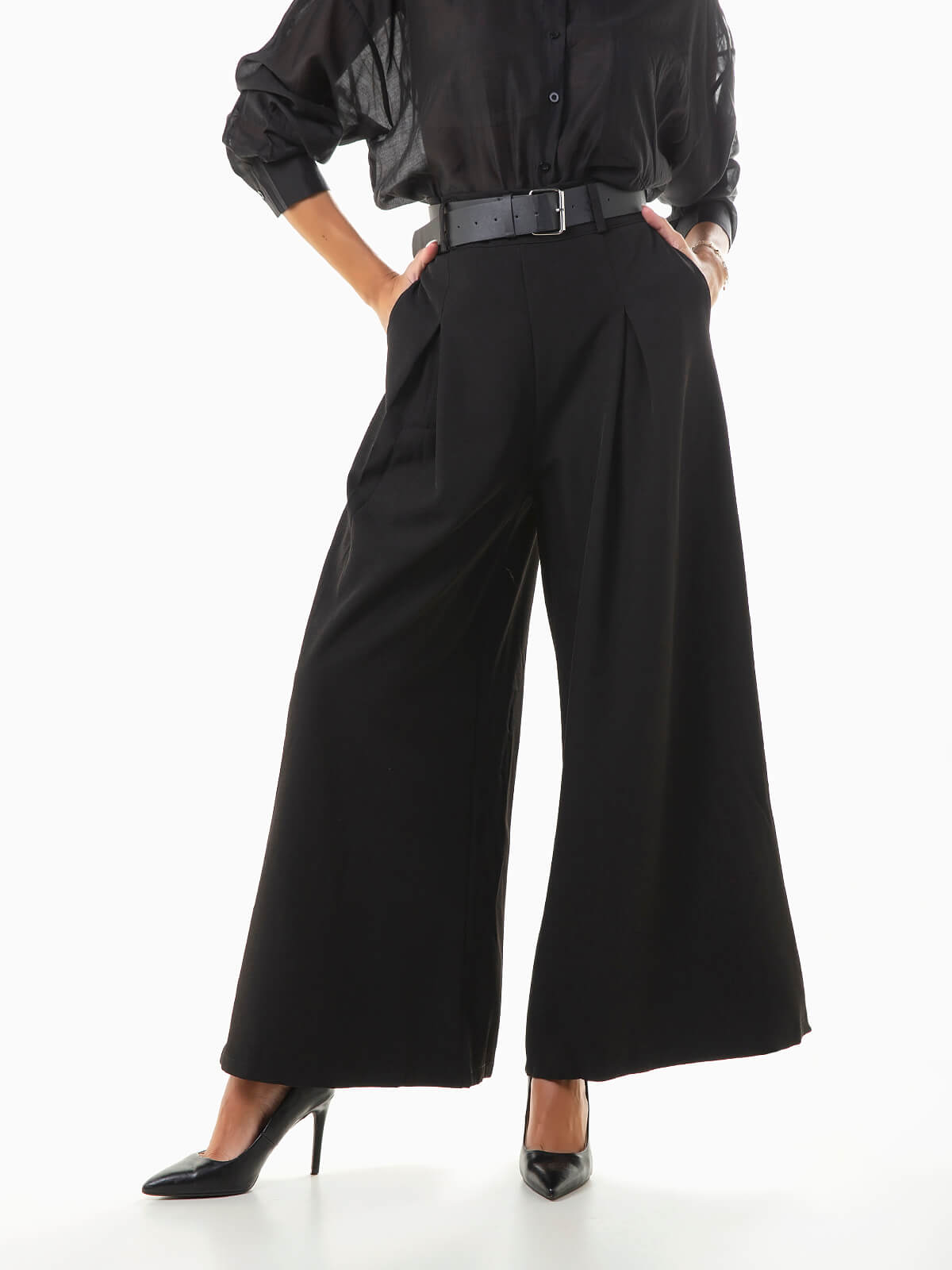 Calças palazzo com pormenor de pinças à frente. Calças largas alfaiataria com cintura alta e cinto em pele sintética removível. 2 bolsos. Aperto posterior de fecho éclair oculto na costura.