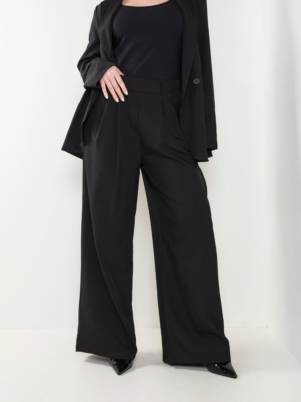 Calças de cintura subida com corte palazzo e pregas frontais. Modelo fluido com bolsos laterais e acabamento elegante, ideal para looks formais ou combinações mais modernas. Uma peça versátil e atual dentro das tendências de moda acessível.