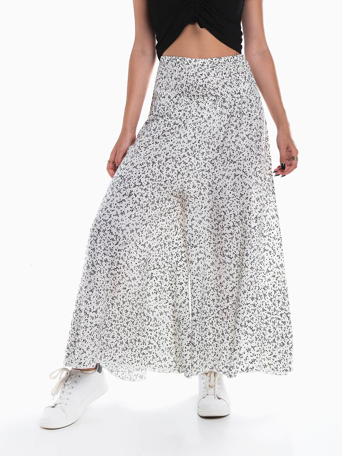 Calças palazzo estampado floral para senhora. Calças fluídas com cintura em franzido smock elástico.