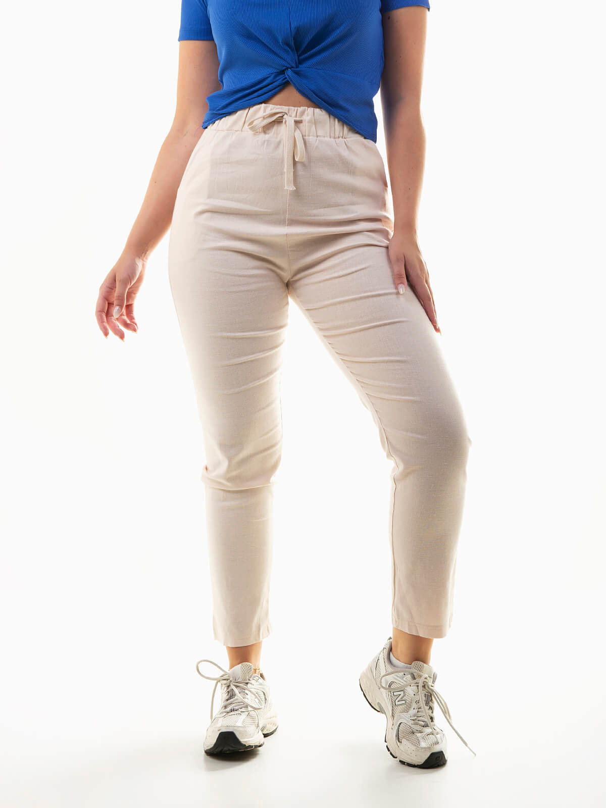 Calças de tecido leve que imita linho, cintura paperbag com cordão para laço e 2 bolsos. Confortáveis e modernas, perfeitas para looks casuais ou outfits de verão mais elegantes. Combina com tops fluidos ou t-shirts básicas e sandálias para um visual fresco e sofisticado.
