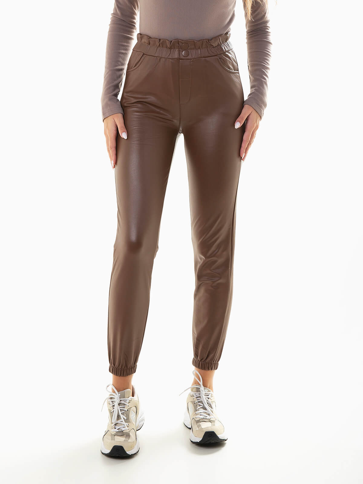 Calças de cintura alta paperbag com efeito pele. Calças para mulher com interior cardado e punhos elásticos. 2 bolsos.