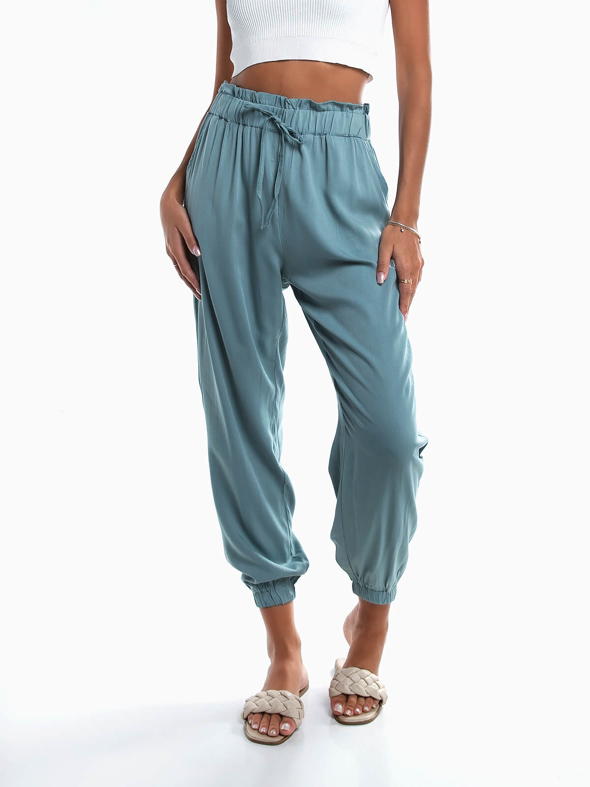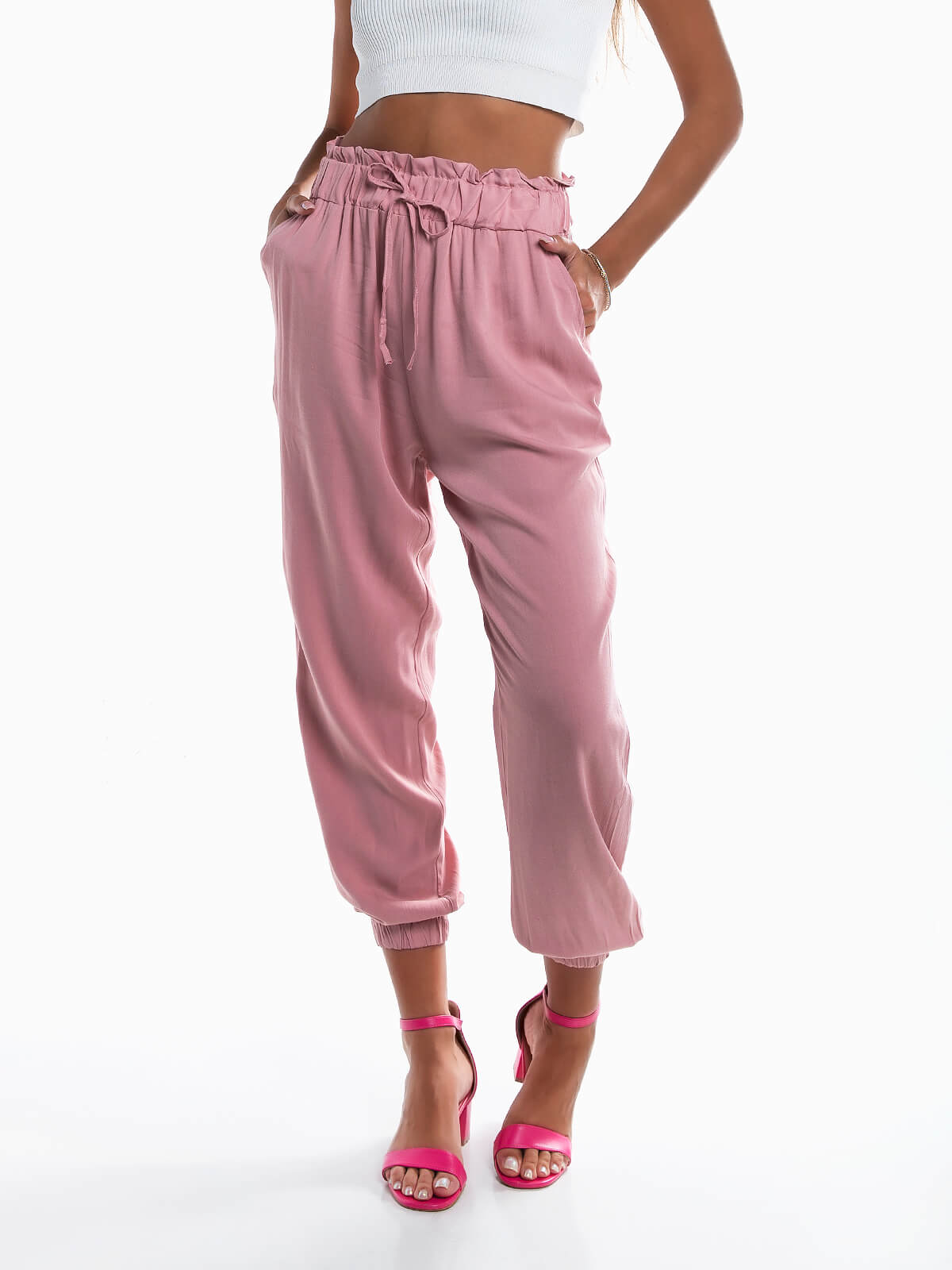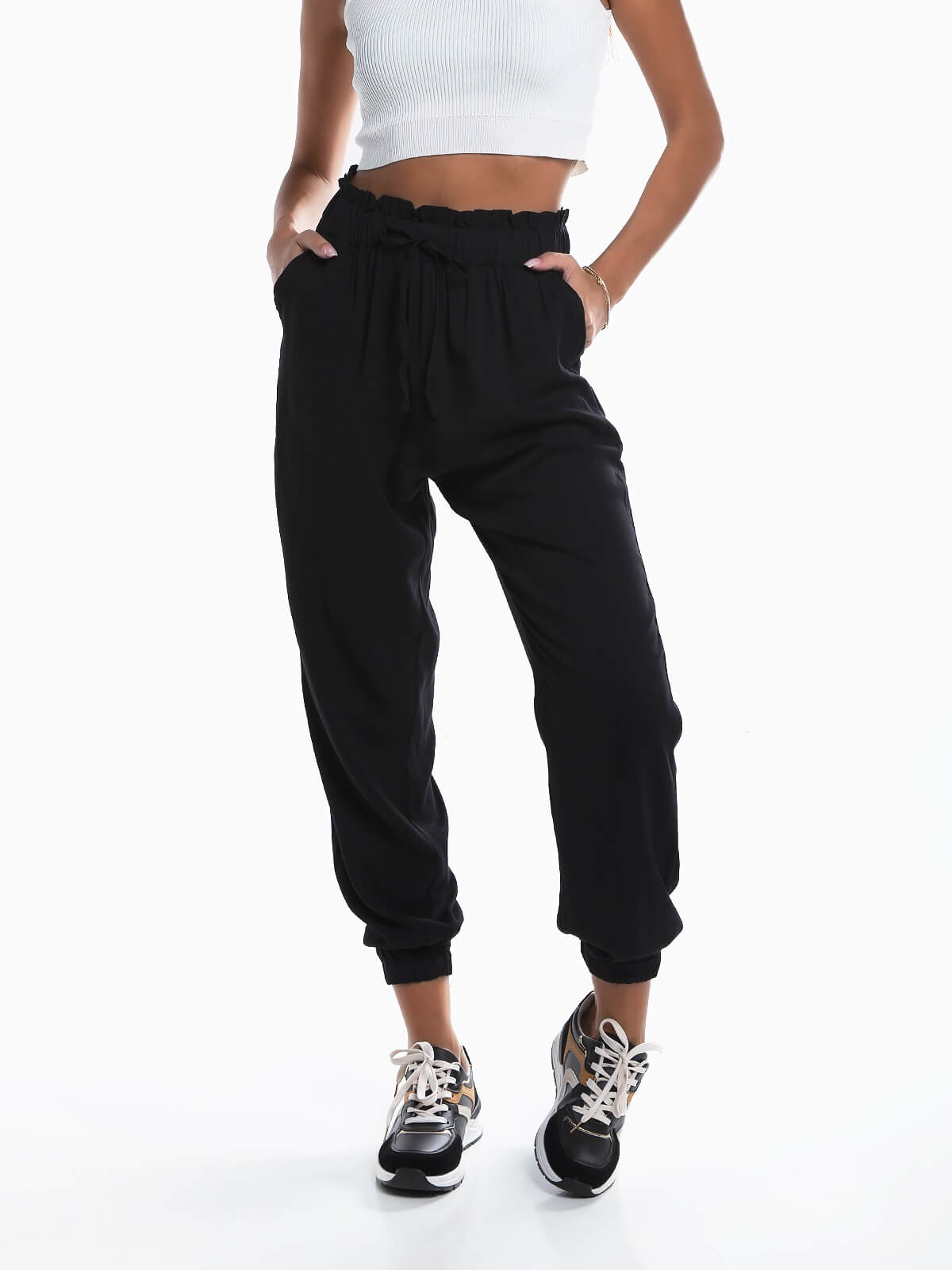 Calças com cintura alta paperbag e punhos elásticos. Calças fluídas com cordão decorativo e 2 bolsos.