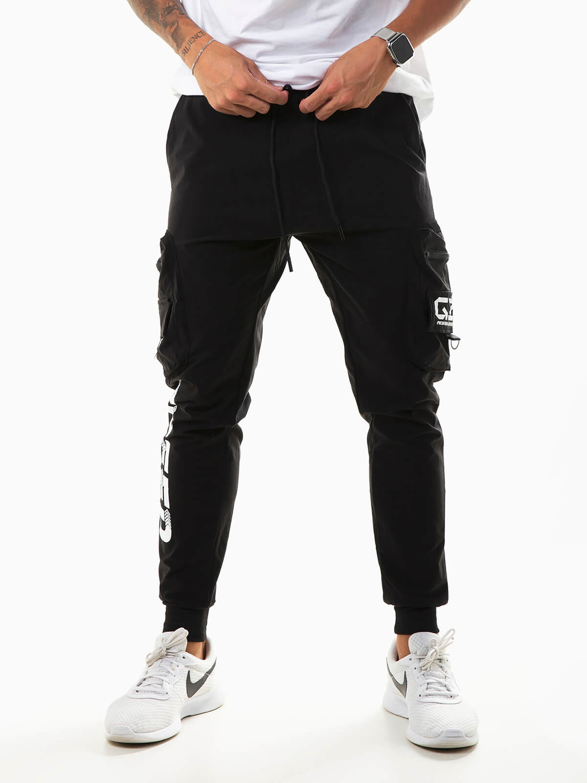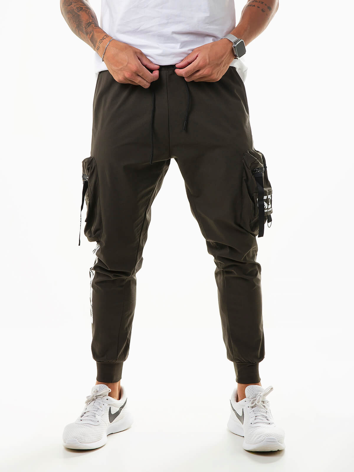 Calças impermeáveis com letras estampadas e sete bolsos. Calças jogger para homem com cordão na cintura para ajustar.