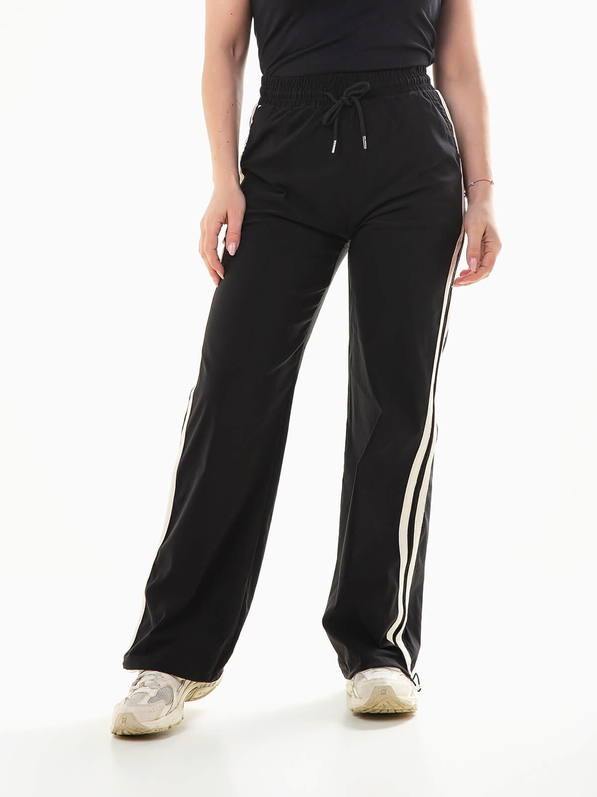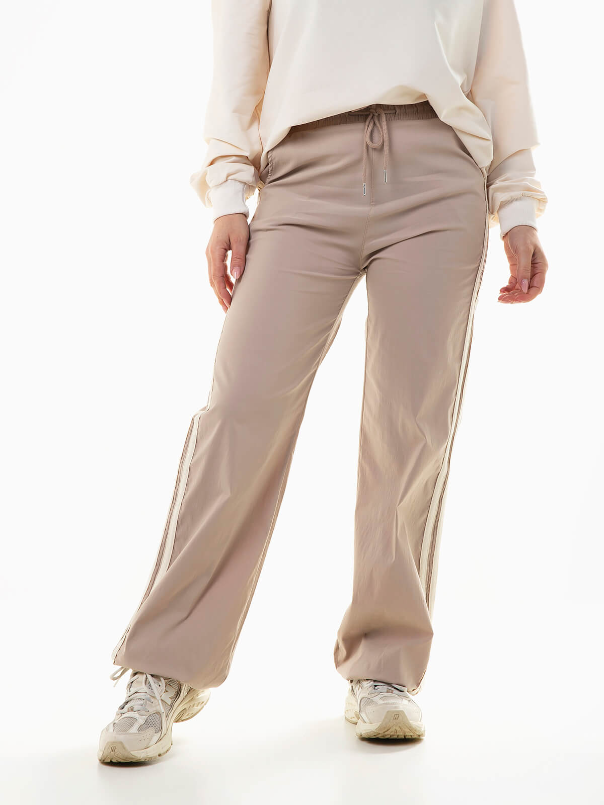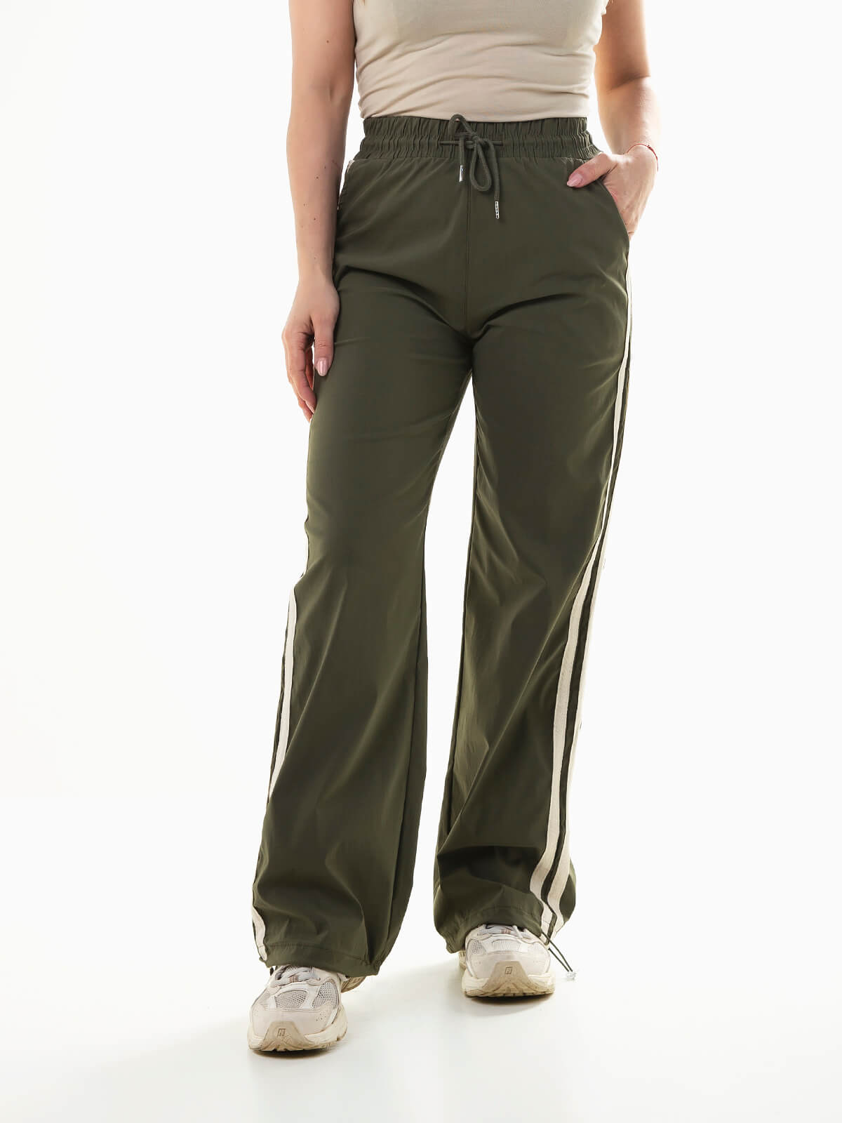 Calças parachute com riscas laterais em contraste. Calças cintura alta para mulher com 2 bolsos. Cordões para ajustar na cintura e punhos.