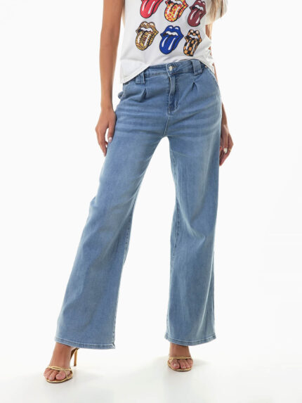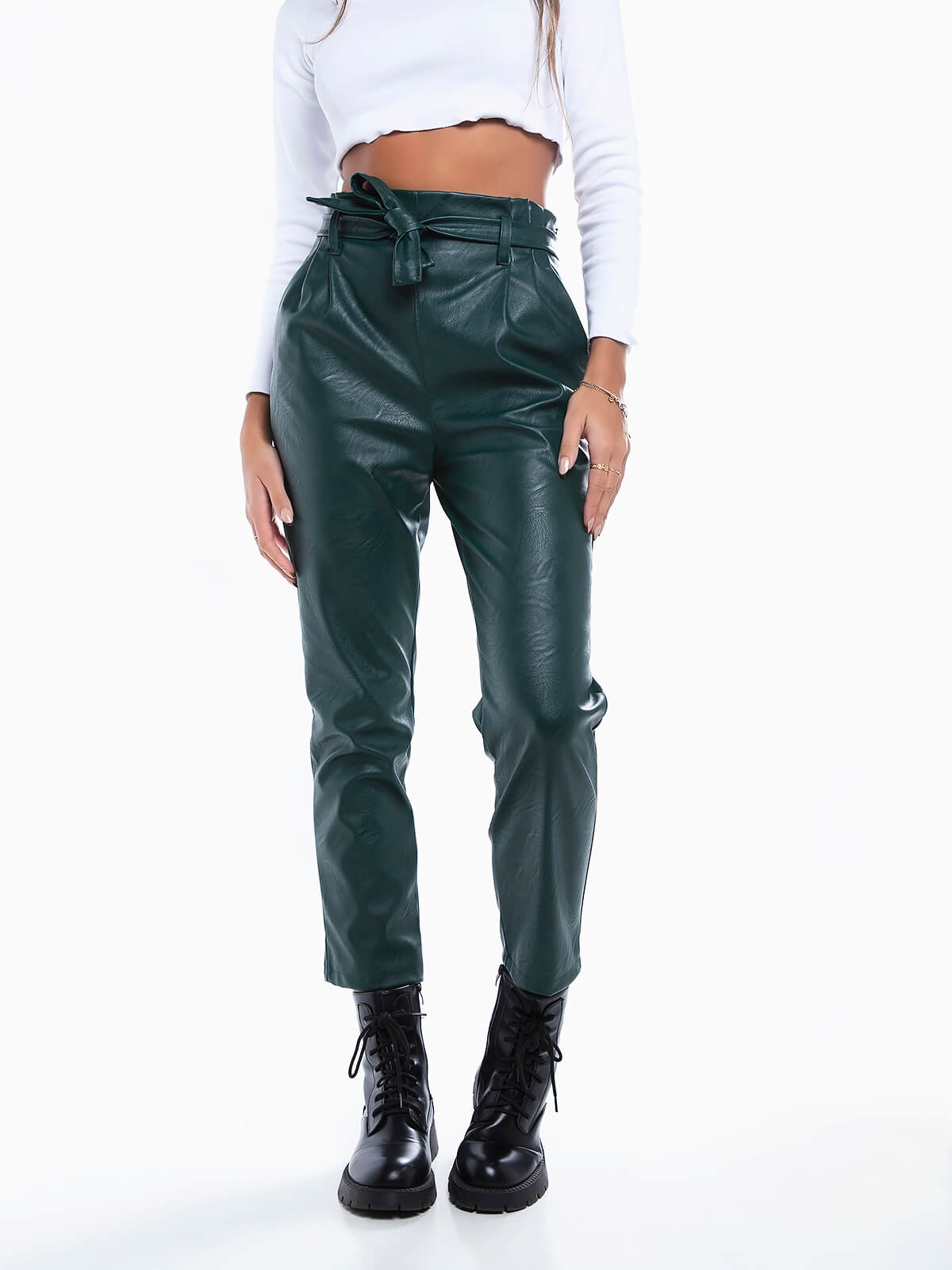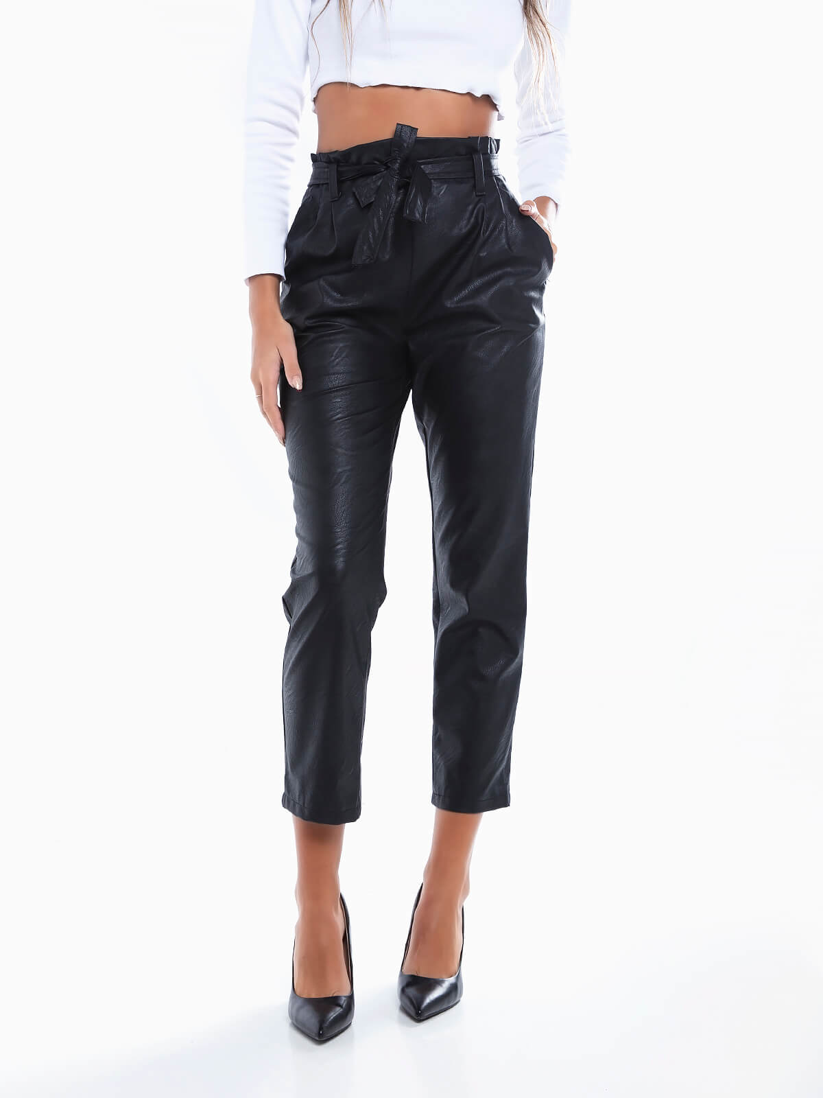 Calças em pele sintética com cinto para laço. Calças cardadas de cintura alta com pregas. 2 bolsos laterais. Aperto lateral de fecho éclair oculto na costura.