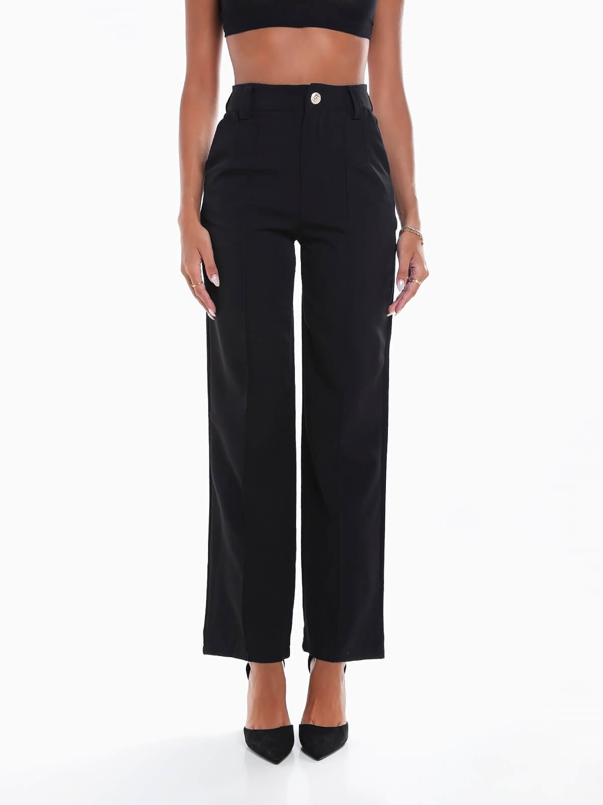 Calças pretas com pinças à frente. Calças de cintura alta com perna reta e corte clássico. 2 bolsos.