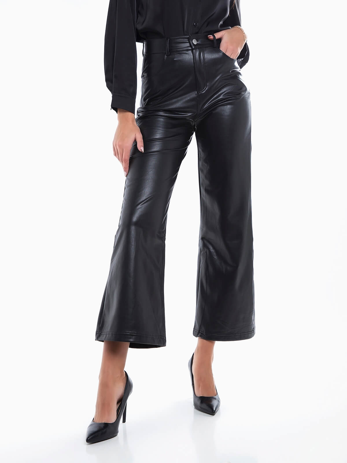 Calças pretas com efeito pele para senhora. Calças de perna larga com cintura alta e interior térmico de toque macio. 5 bolsos. Aperto fecho éclair e botão.