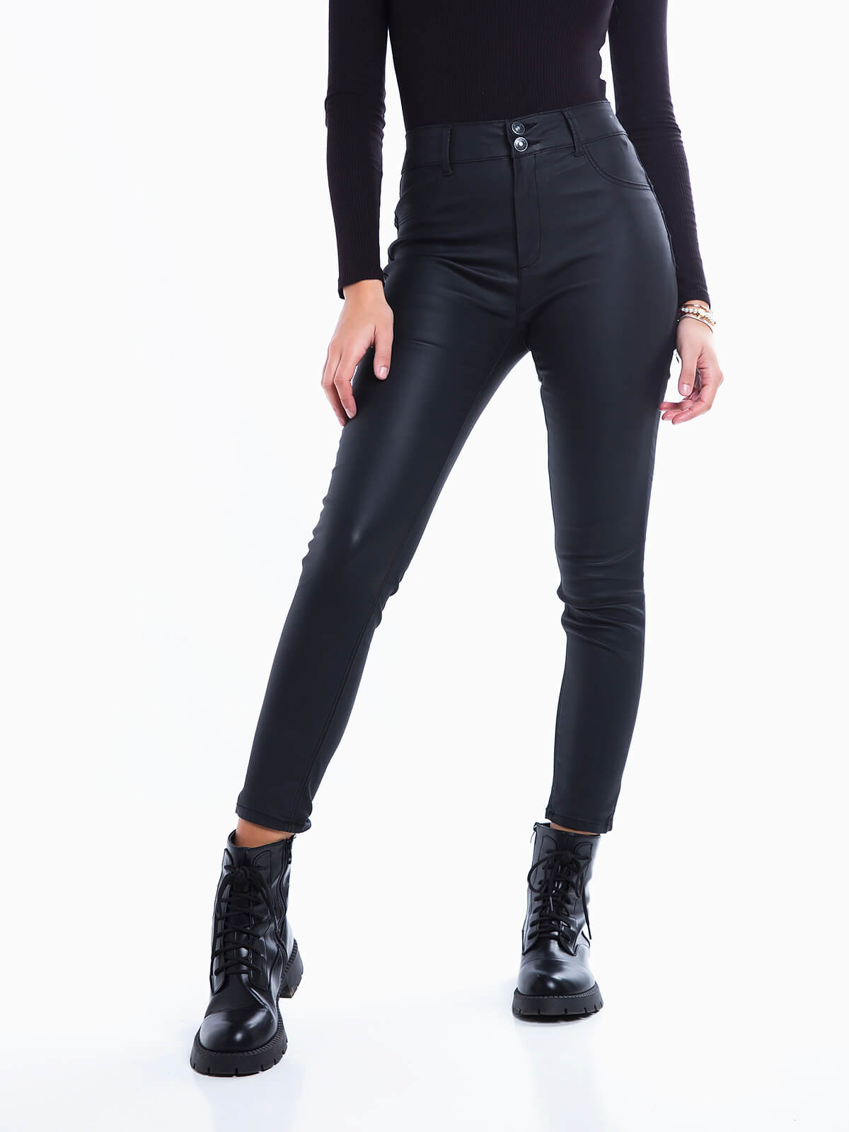 Calças pretas skinny em pele sintética. Calças com efeito push up. Bolsos atrás. Aperto com fecho éclair e 2 botões.