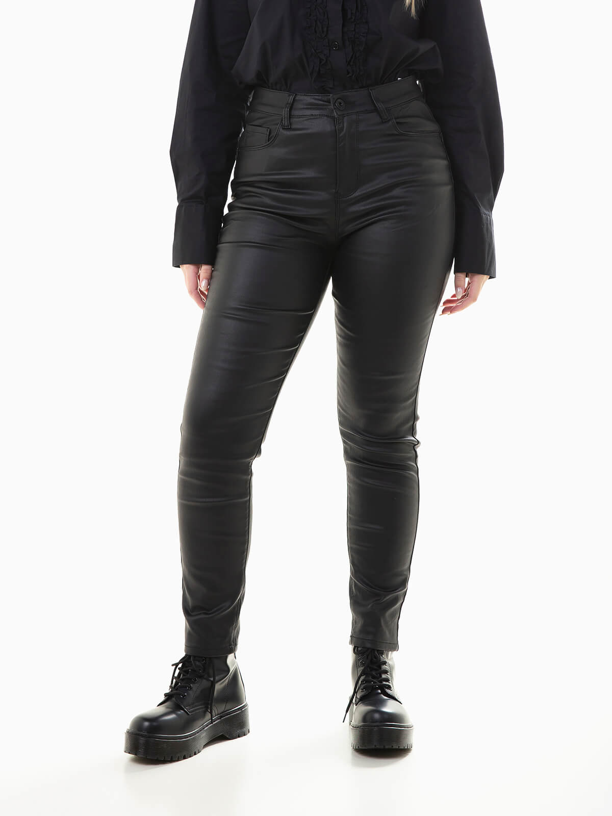 Calças em pele sintética pretas com efeito push-up para senhora. Calças justas com cintura alta e interior cardado. 5 bolsos. Aperto fecho éclair e botão.