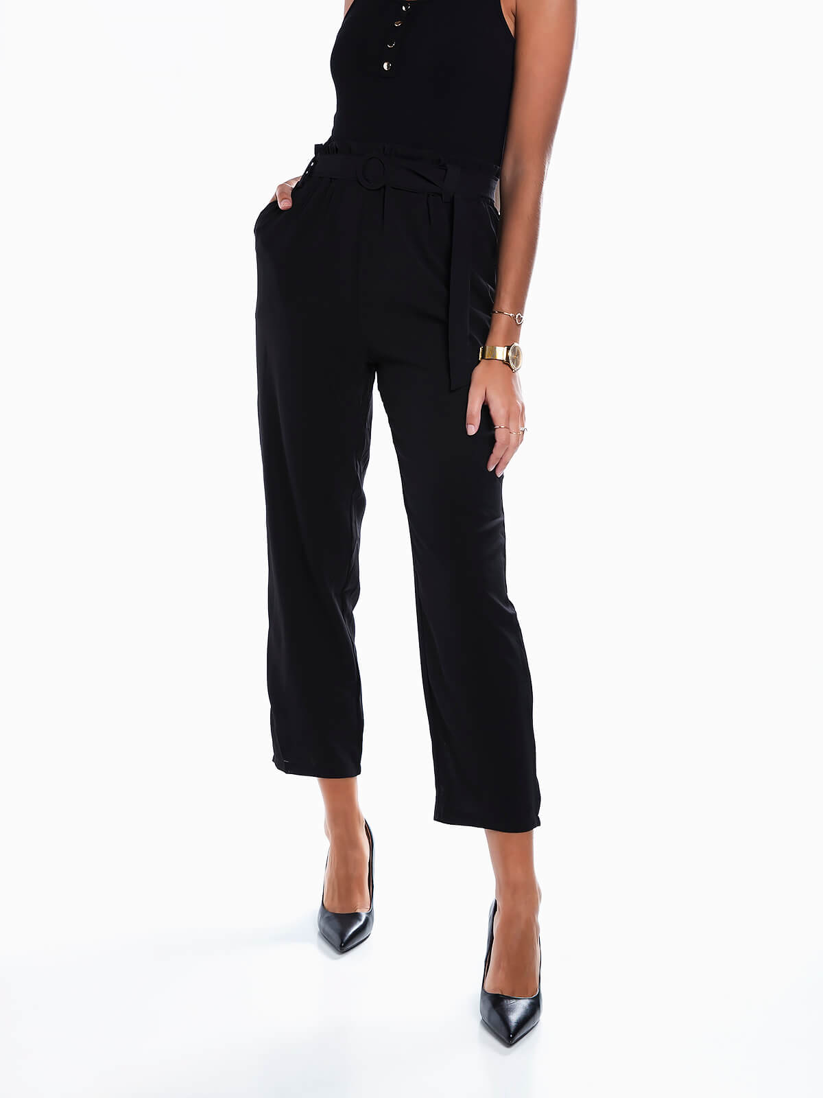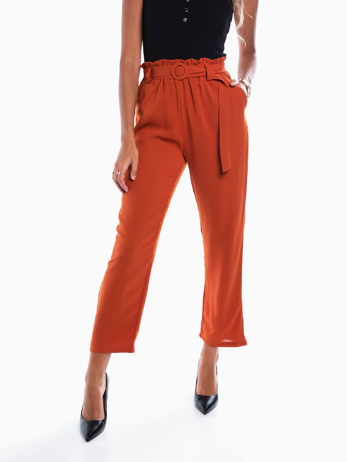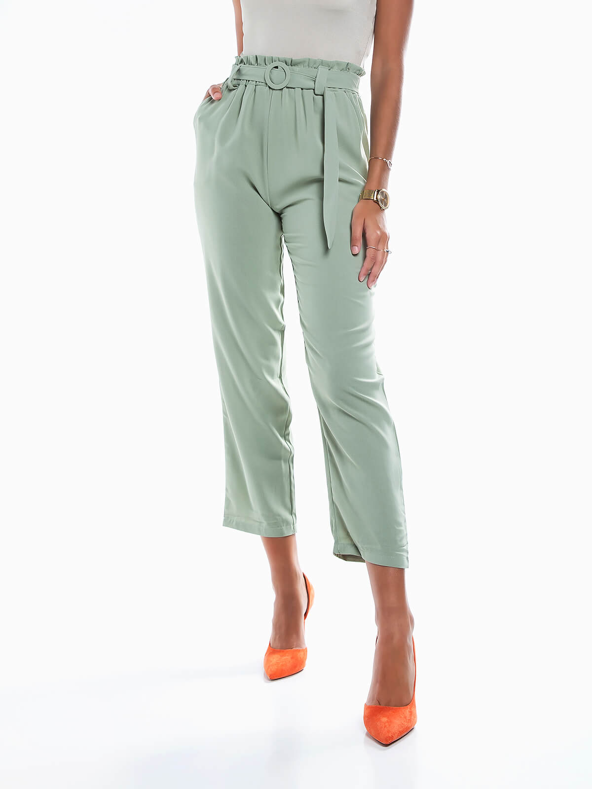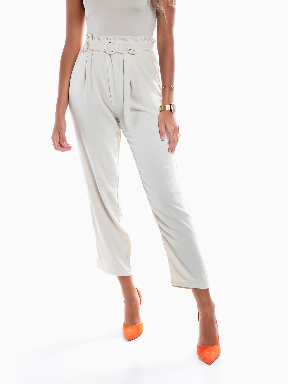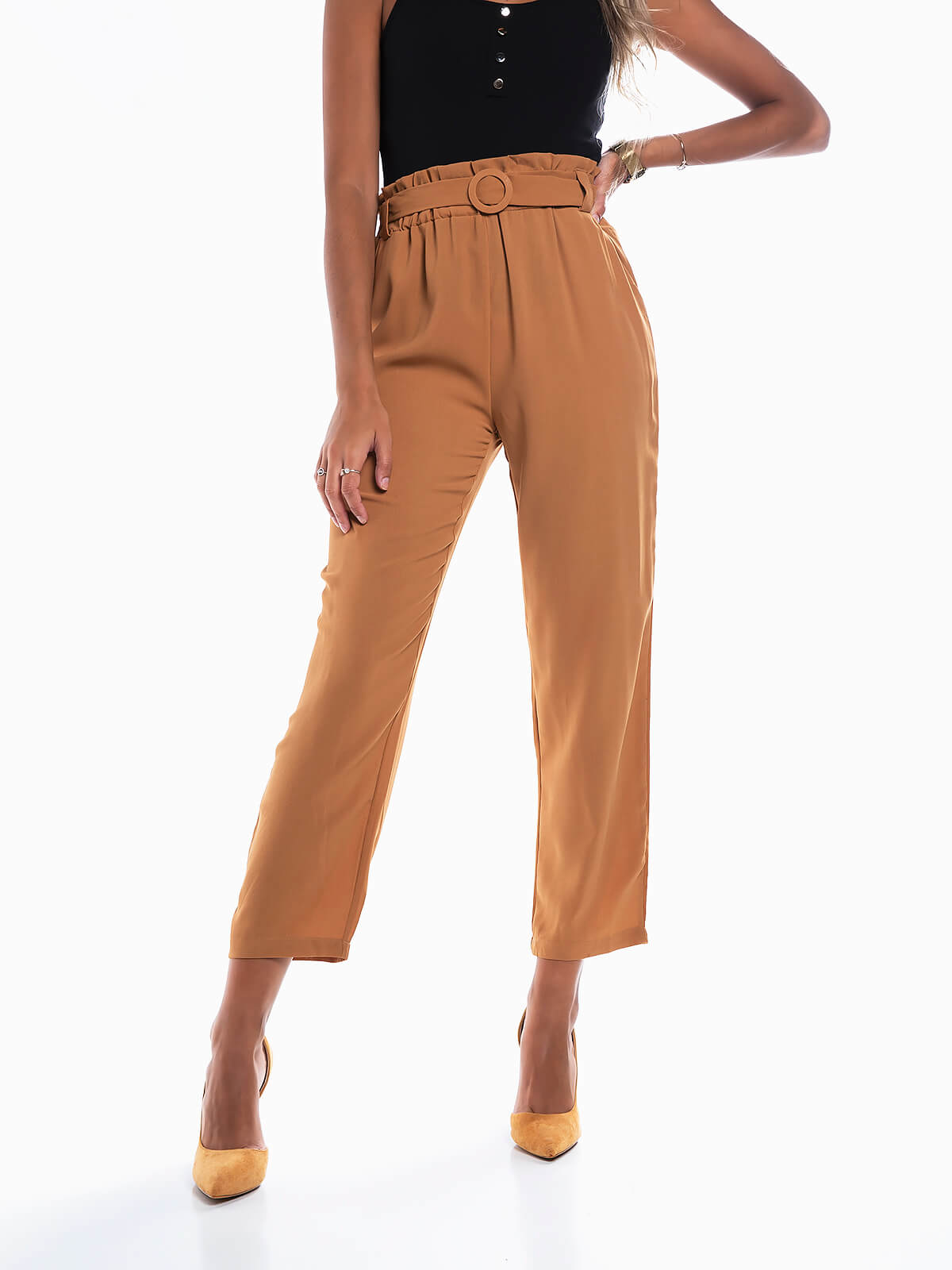 Calças retas com cinto de fivela redonda. Calças fluidas cintura alta. Bolsos laterais.