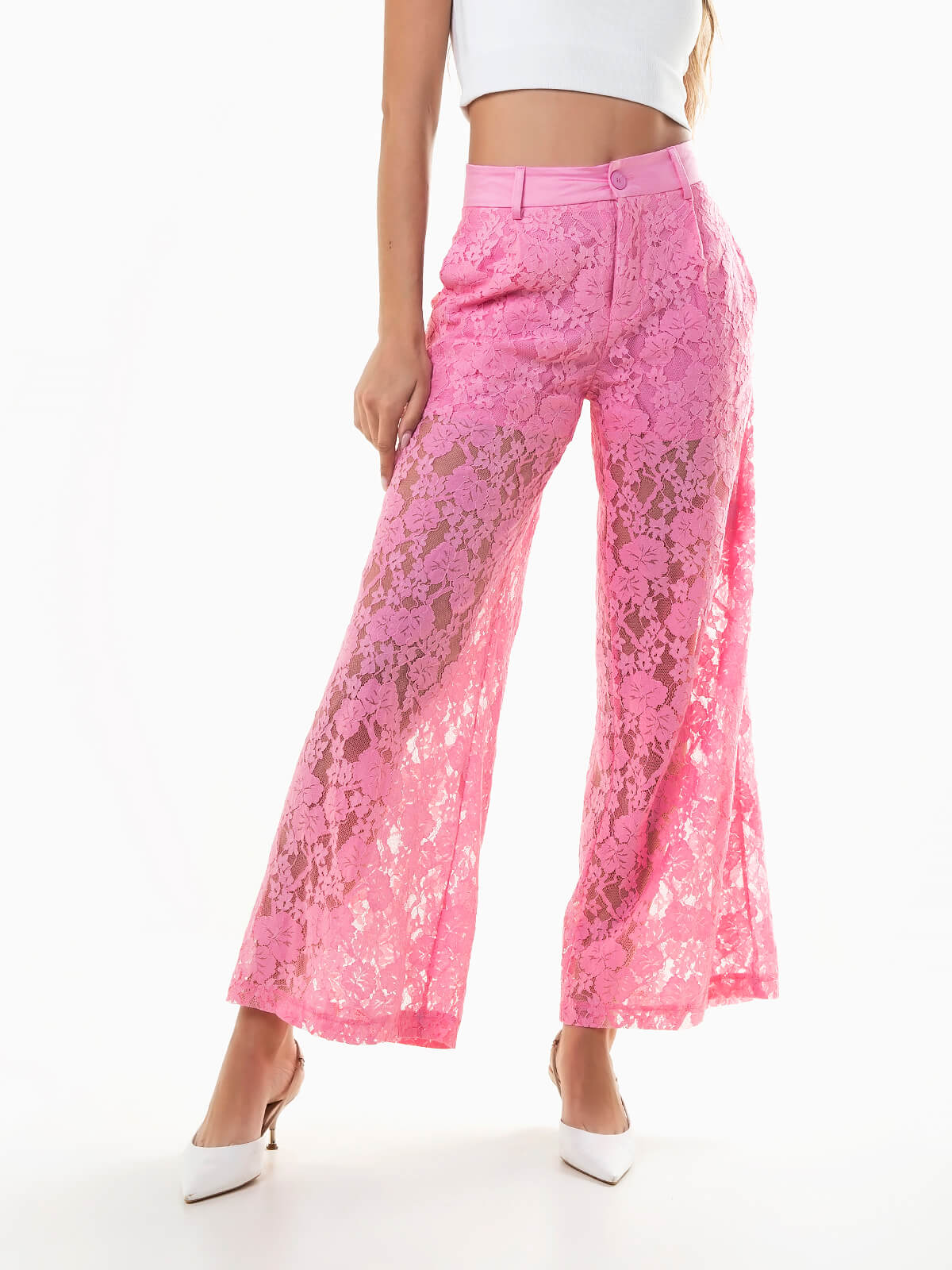 Calças rosa de cintura alta em renda com interior forrado. Corte reto e fluído. 2 bolsos. Aperto fecho éclair e botão.